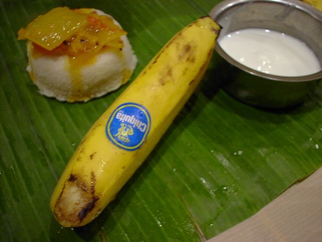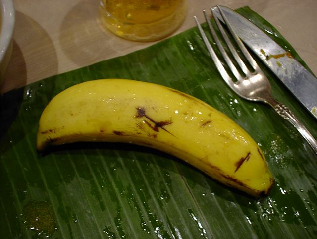 - やはりこうしてバナナの皮をお皿にして食べると美味さ倍増でした。ここでも手づかみで食べようとしましたが、熱くて熱くて。(bouz)