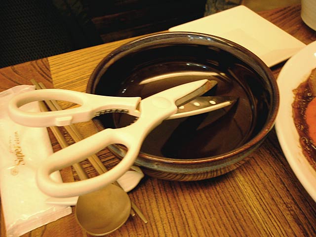 - 鶏と春雨や野菜がいっぱい入っています。キッチン鋏が出てきたので鶏が丸ごとなのか?と思ったけど、そうじゃなくて長い春雨を切るためのものなんだそうです。(JK)