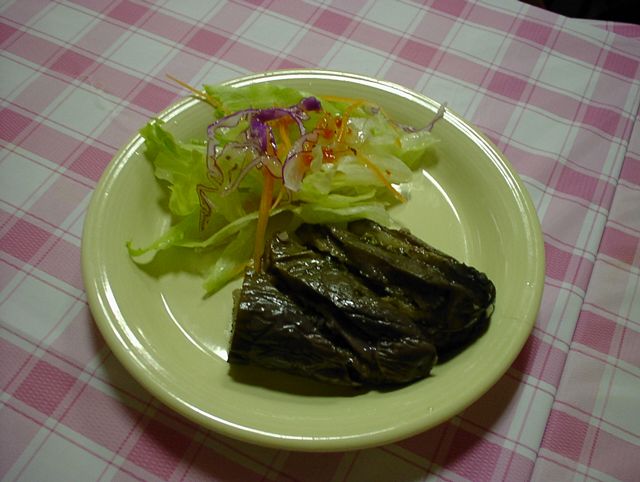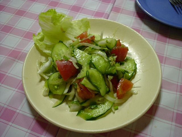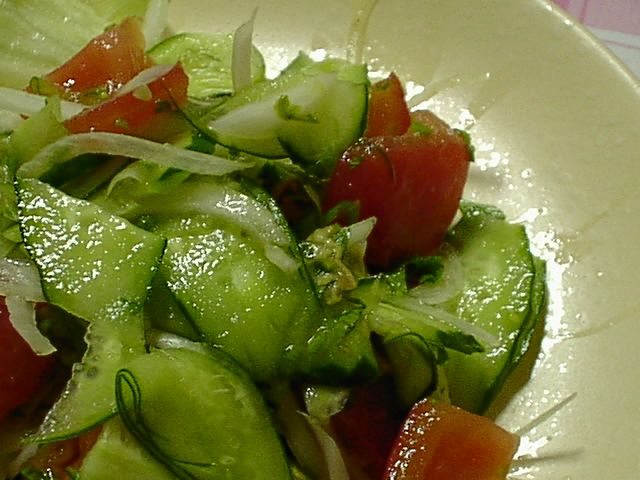 - キュウリ、タマネギ、トマトのシンプルなサラダですが、生唐辛子が入っていて、これに当たるとピリッと辛くて美味しいのです。(め)
