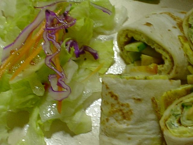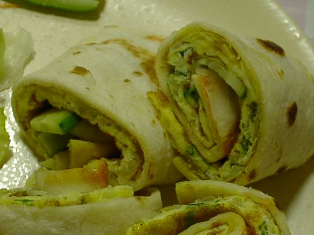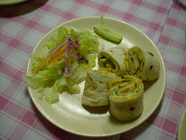 - 野菜と玉子焼きをチャパティで巻いたもの。塩気が利いていて、酒のおつまみにもなるかも。(め)