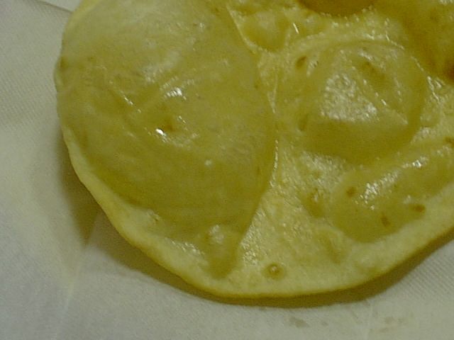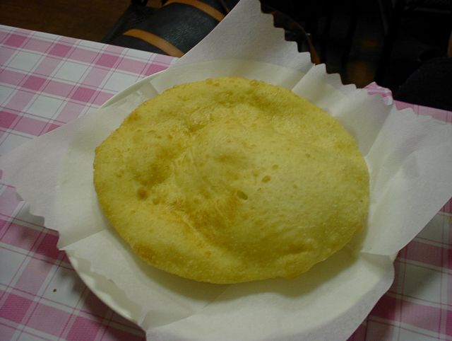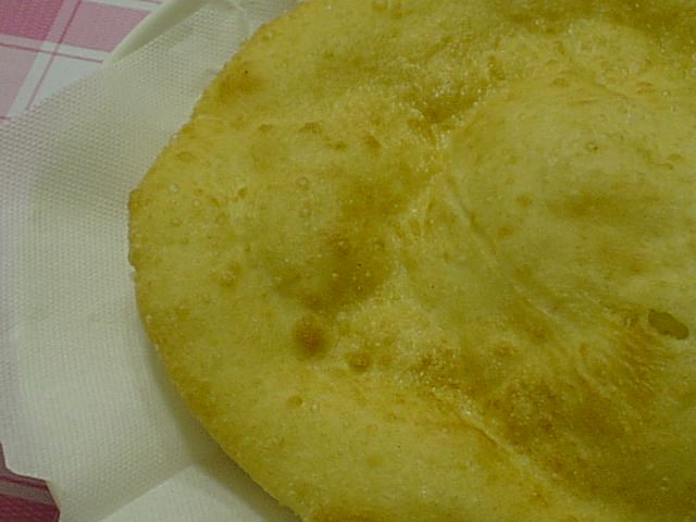 - ルチを食べながら「プーリーと比べてどうこう」って話してたのがお店の人に聞こえたのか、プーリーをサービスしてくれました。よくある全体がぶわっと膨らんだプーリと違って、一部だけ膨らんでますね。揚げたチャパティという感じの味でした。(め)