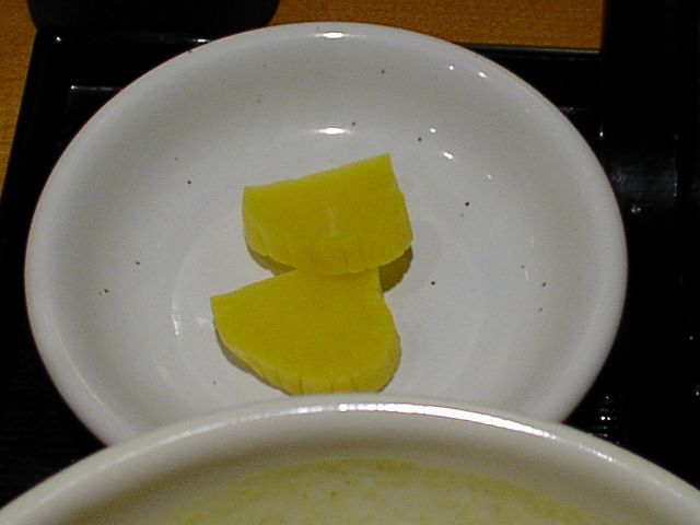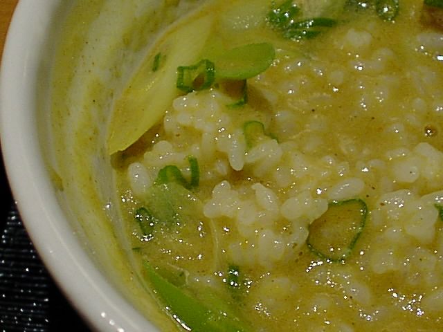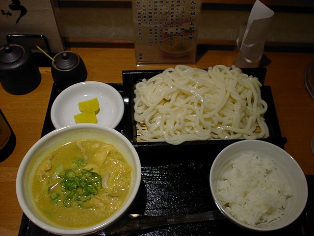 - 普通の温かいのもあったけど、ちょっと暑い日だったので迷わずつけざるにしました。これから寒くなるから冷たいの食べるならいまのうちだし。つけダレは温かいカレーうどんのダシの中にきざんだお揚げと薄切りの豚肉が入ってます。かかってるネギも青ネギだし、お揚げも近年の東京に多い厚ぼったいやつじゃなくて薄手でさらっとしたお揚げで嬉しい。具の量も僕としては申し分なしです。麺もちゃんと注文してから茹でているらしく、元気でコシのある麺です。カトキチの冷凍うどんを戻した感じに近いですが、それ以下の麺を出す店のほうが多いのが実情ですから、かなりのレベルに達しているということです。つけダレにつけて食べてみると、ちょうどよく麺にからまり、濃度も非常によく考えられているなと感心します。このつけダレ(つゆというべきか)の味がまたすばらしく、カレーのスパイシーな香りを楽しませながらとがった所がなく、適度に辛く適度にマイルドといった丁度よいバランス。塩気も強すぎず弱すぎず、すべて食べ終わるまできっちり美味しく食べられました。机の上に「うどんを食べ終わってから残ったつゆにご飯を投入して食べよ」とおすすめの食べ方が書いてあったのでそれに従いましたが、このカレーおじやがまた美味しいこと。「カレー雑炊」としてメニューに載っているのも納得です。この一粒で2度美味しい作戦には参りました。ほとんど文句のつけようのない内容でしたが、強いてアラを探すなら、タクアンはあんまり合わないかも。いやしかし、そんなことを言うとバチがあたりそうなくらい美味しくいただきました。大満足です。(め)
