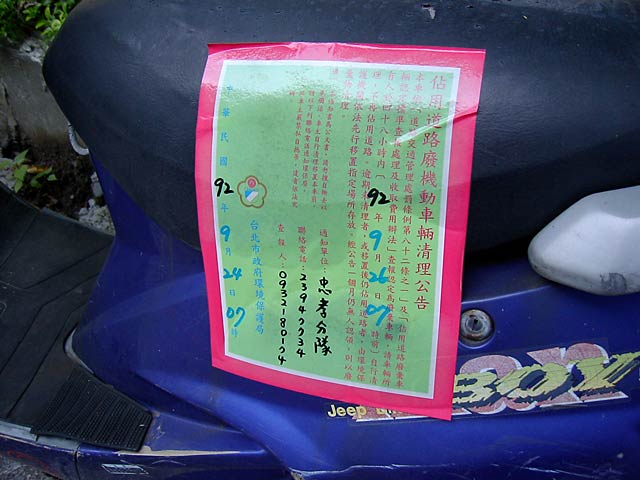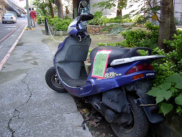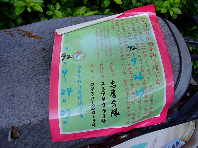 これはたぶん不法投棄でしょうか。ナンバー付いてないし、警告っぽいものが貼ってあるし。