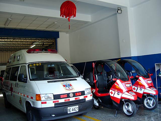 「派出所」ですね。救急車や救急バイクみたいなのもありますね。台湾では消防署ではなく派出所にあるものなのでしょうか? でも電話する時は警察が110で救急車は119と別だそうですけど。