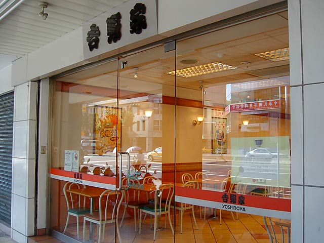 吉野家(正しくは1文字目上は「土」ね)。日本風のカウンター中心のレイアウトではなくカフェ風のレイアウトですね。