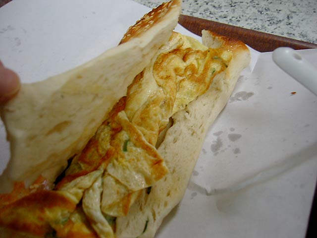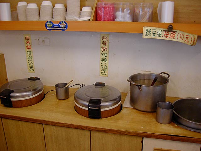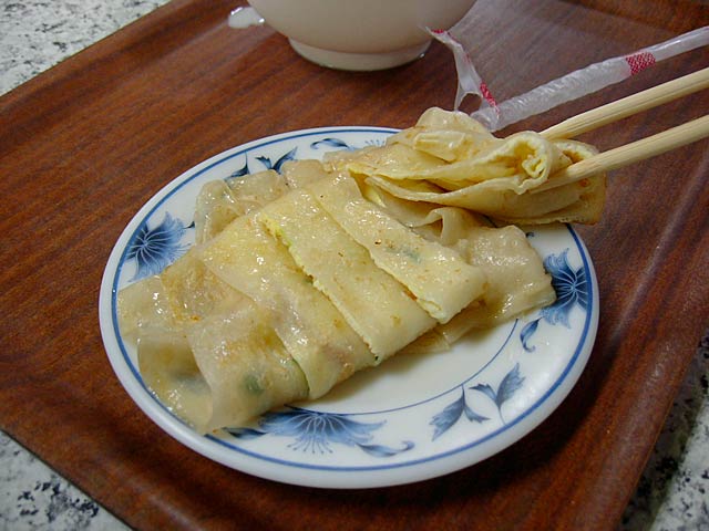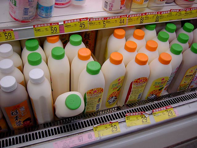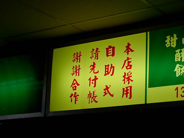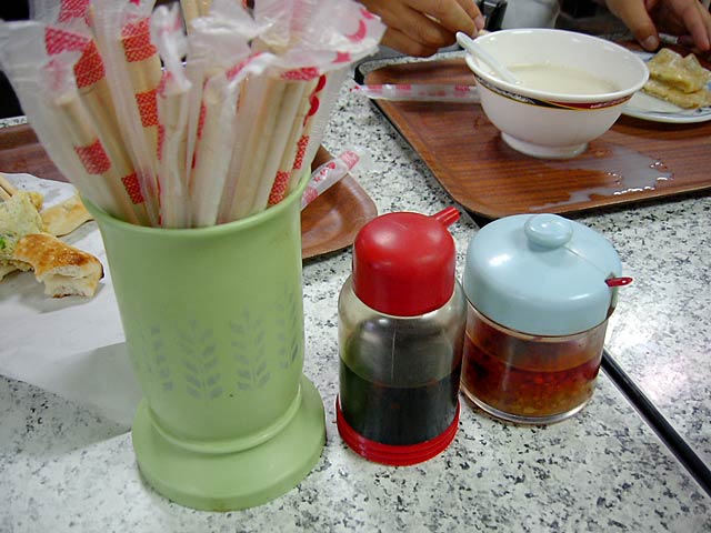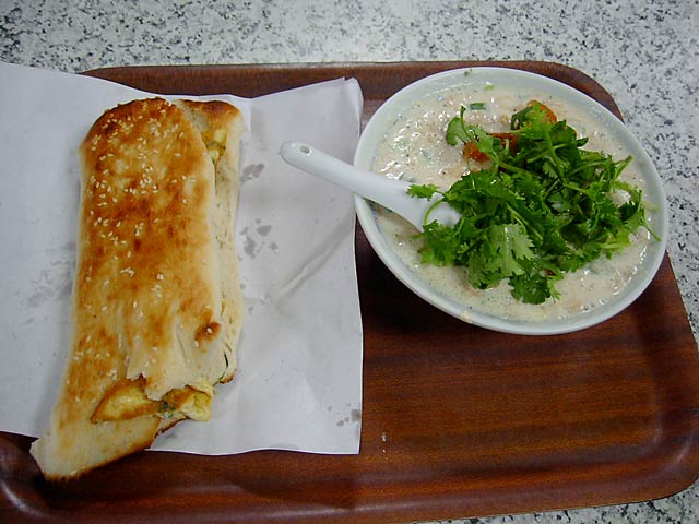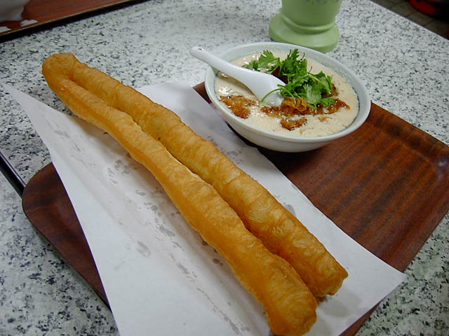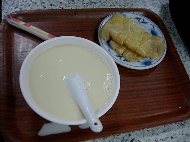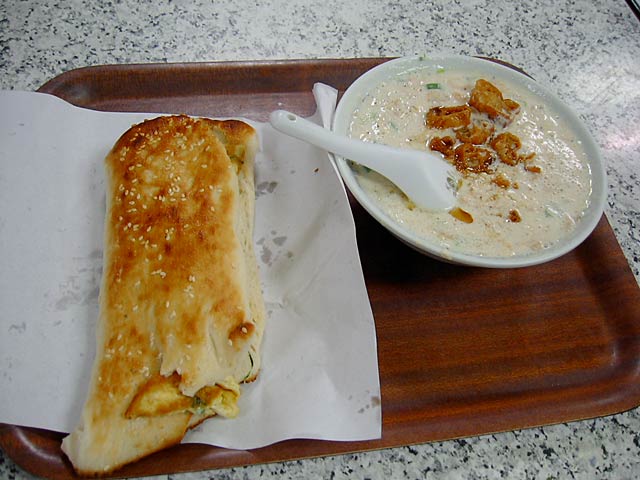 日本人向けには「甘いの=豆漿」「からいの=鹹豆漿」とカタコトの日本語で区別してくれてました。実際には「豆漿=甘み付きプレーン」「鹹豆漿=調味味付き」といった感じです。鹹豆漿は辛くはありません。(JK)
