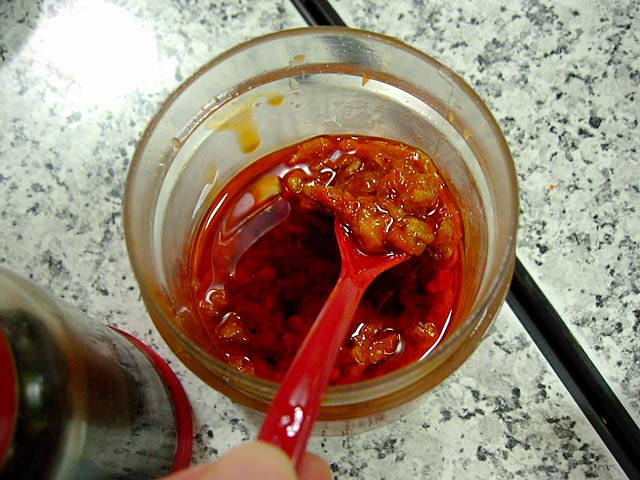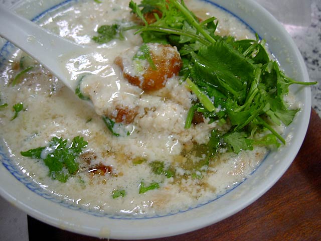 鹹豆漿(18元)は、はじめにお皿に小エビや葱・調味料を入れ、そこに熱々の豆漿をなみなみと注ぎ込み、醤油+αの調味料を入れ、更に上に1cm巾くらいに切られた油條をぱらぱらと入れます。香菜は自分で好きなだけ入れます。(JK)