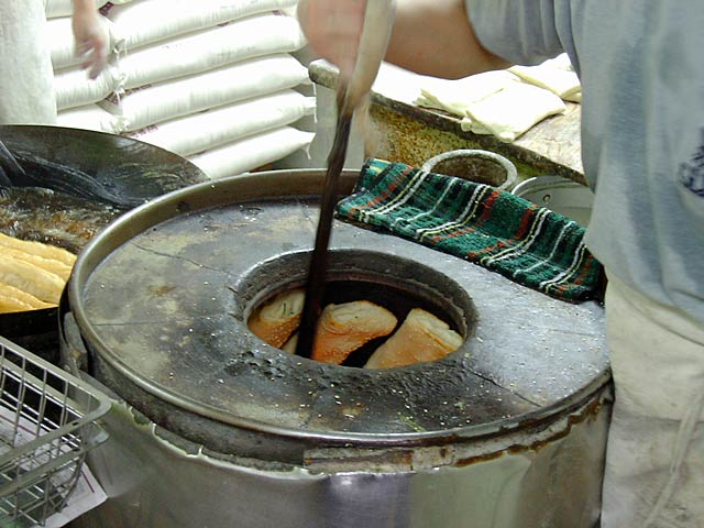 ![]() (1.8Mbyte) | 焼餅はナンを焼くのと似ており、炭火の釜の内側に貼りつけて焼いてました。ナンよりだいぶ分厚いのに貼りつくってスゴイ。(JK) |