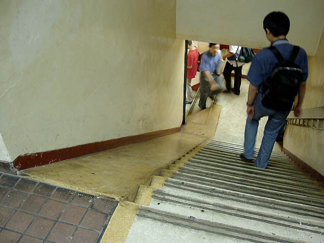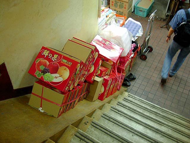 市場の階段横のスロープは段ボールを楽に降ろすためのものだそうですが、下の方は段ボールが積み上がったままになってますね。階段部分に置きっぱなしにするよりは安全、かな。(^^;