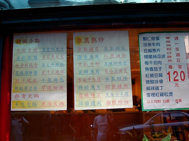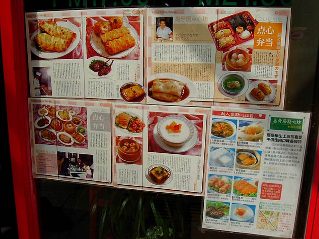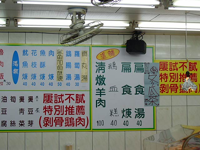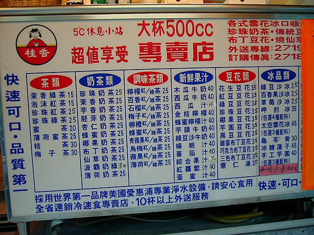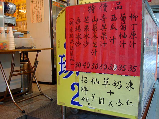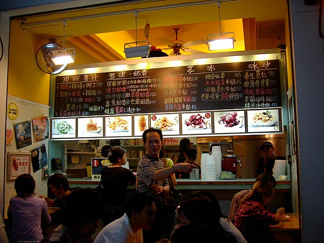 大きく書いてある「熱呼呼甜食」は、「熱呼呼」は「あつあつの」、「甜食」はデザート、だそうですが、冷たいデザートばっかりなのに? (JK)