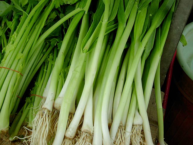 わかった! 「葉大蒜(葉ニンニク)」ですね。中国系の料理で鱗茎が肥大する前の葉を利用するようです。だから写真も根っこは全然太くなってないでしょ。(JK)