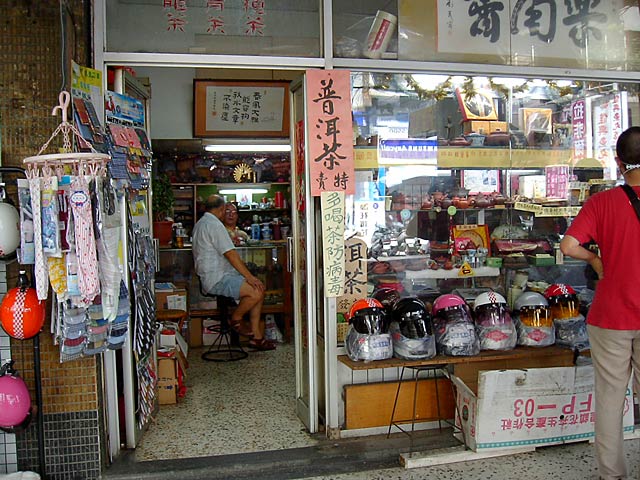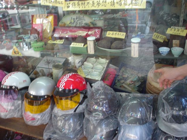 お茶屋でヘルメットを売ってます。台湾でもレアケースだと思うけど。(^^;