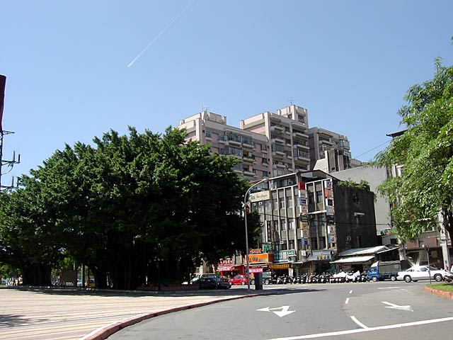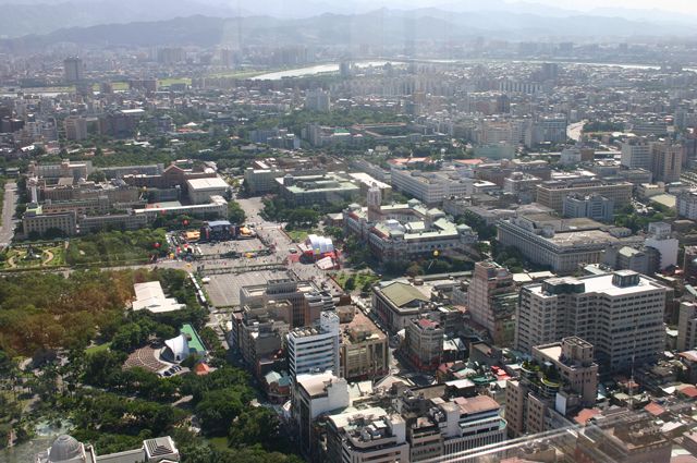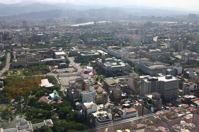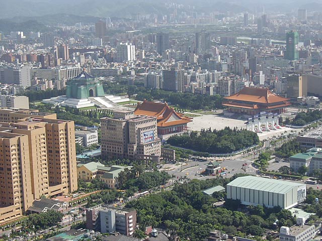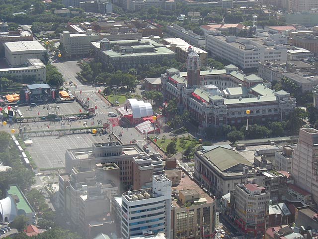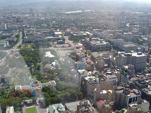 左の茶色い高層ビル群が台大病院、その右が國民党本部、で中正記念公園。公園奥の特徴的な建物が中正記念堂。國民党本部の前の道の真ん中にポツンとあるのが景福門(東門)だそうです。