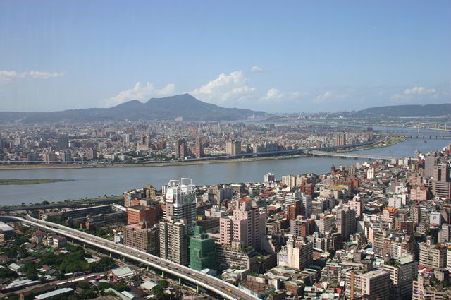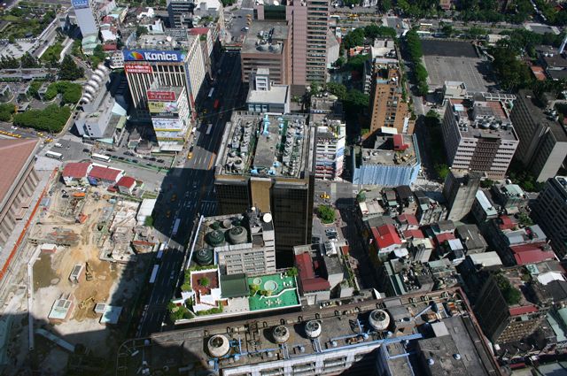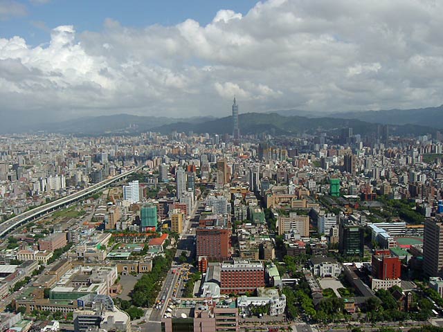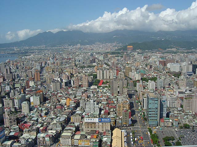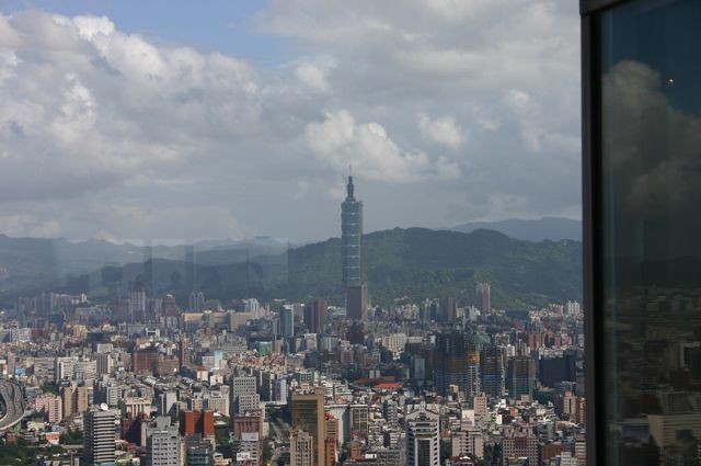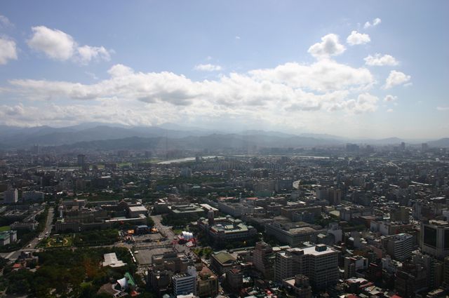 新光摩天大樓から東方向の景色。 遠くに見える超高層ビルは市政府にある「台北101大樓」。新光摩天大樓の1.7倍の高さだそうです(508m)。 |