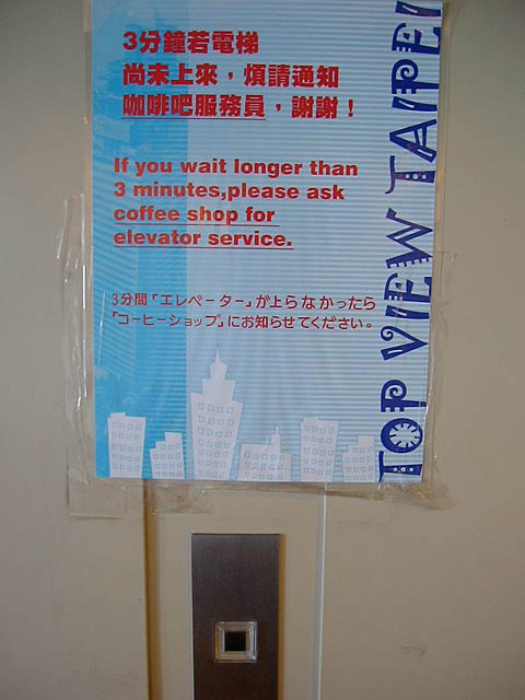 『三分間「エレベーター」が上がらなかったら「コーヒーショップ」にお知らせください』。
