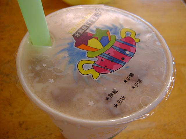 珍珠[女乃]茶は初めて飲むのですが、これも美味しいです。みんなこういう風にカップをシールしてくれるんですよ。(JK)