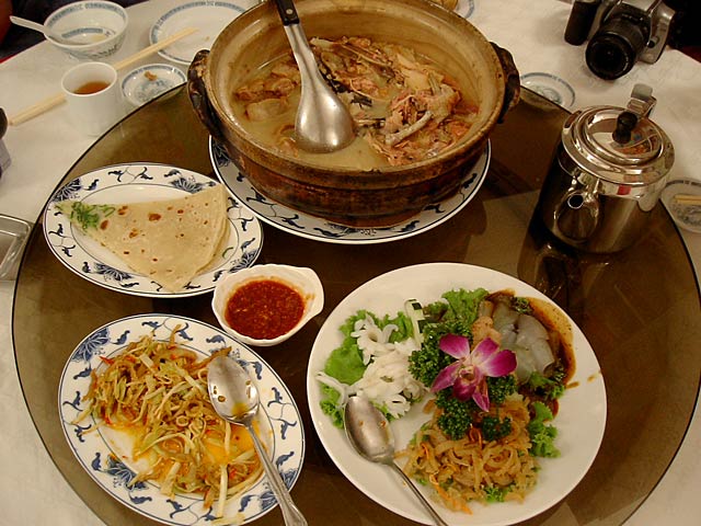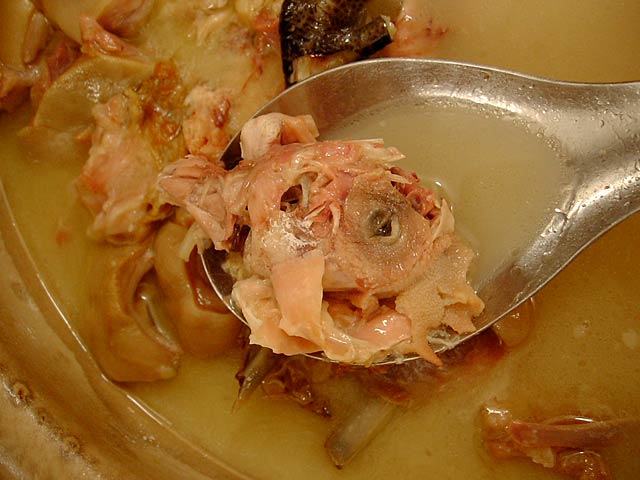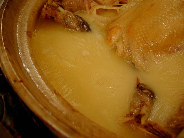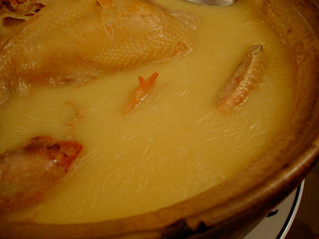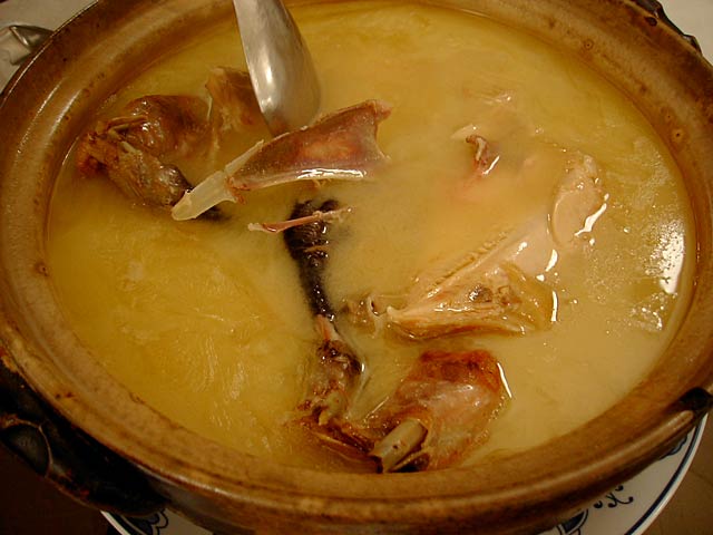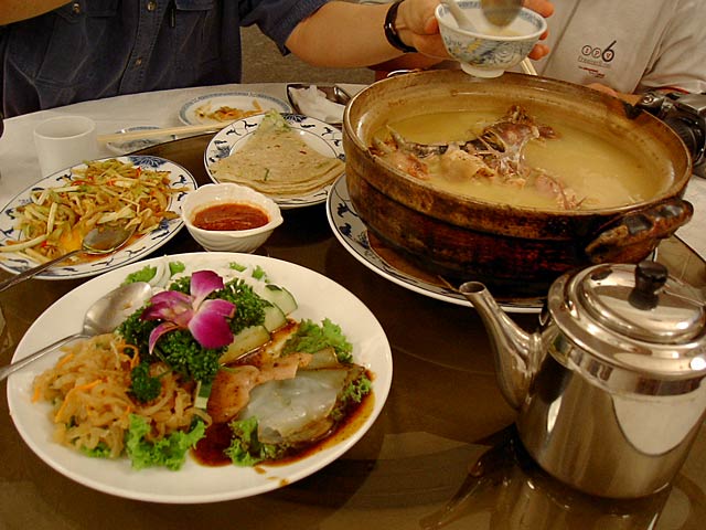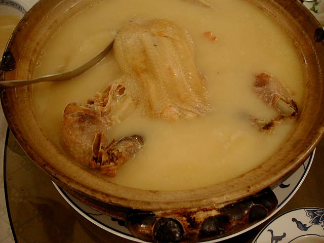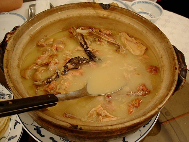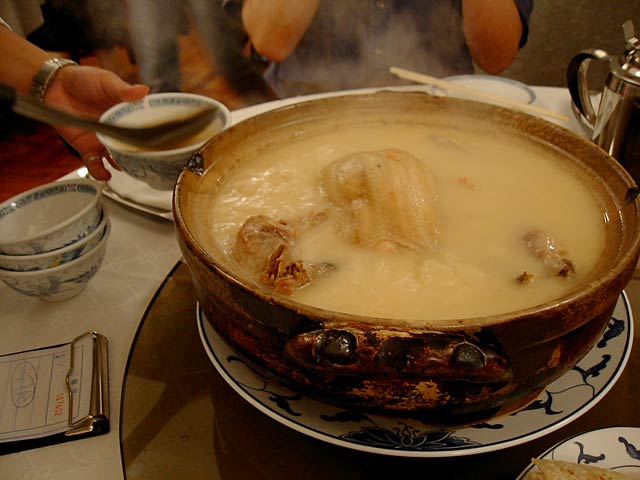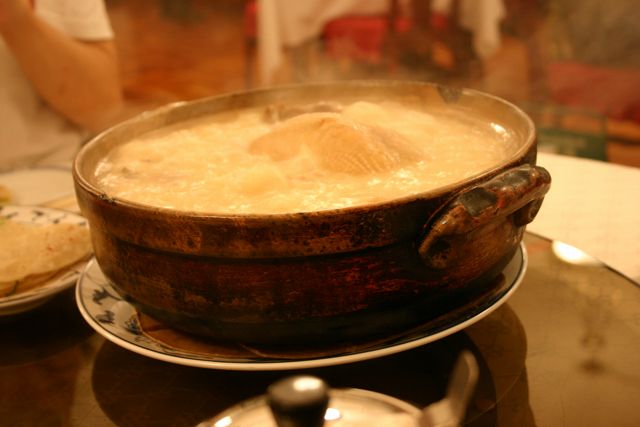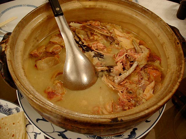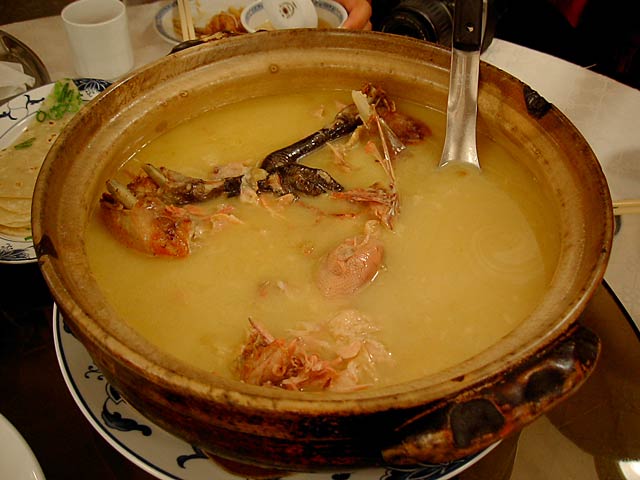 これが名物の10時間煮込んだ「砂鍋土鶏(1600元)」。グツグツすごい迫力です。 ここは四川料理のお店なのですがこの鍋はこの店のオリジナルで、辛くはないです。(JK) 土鍋が迫力がありました。天下一品のらーめんスープをもっと強くしたような味わいです。鳥と豚がよく煮込まれていて、きわめて濃い味付けです。最初の印象はかなり良かったけど、四人で食べきるにはちょっと単調かな。(ska) |