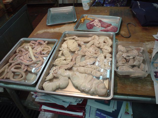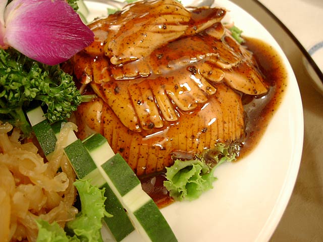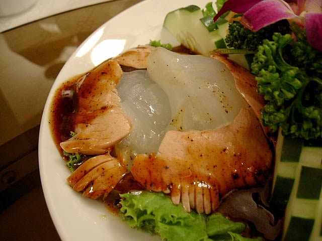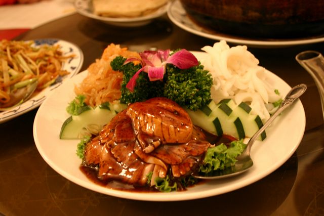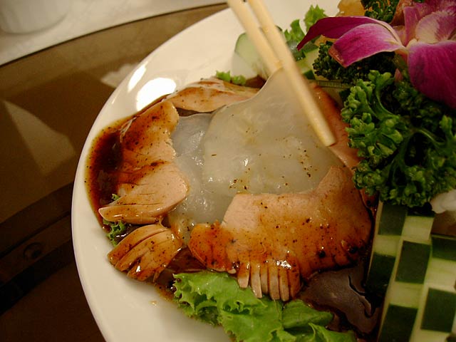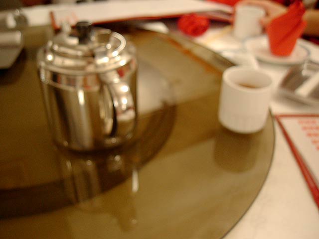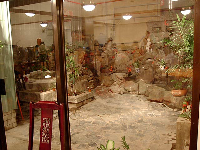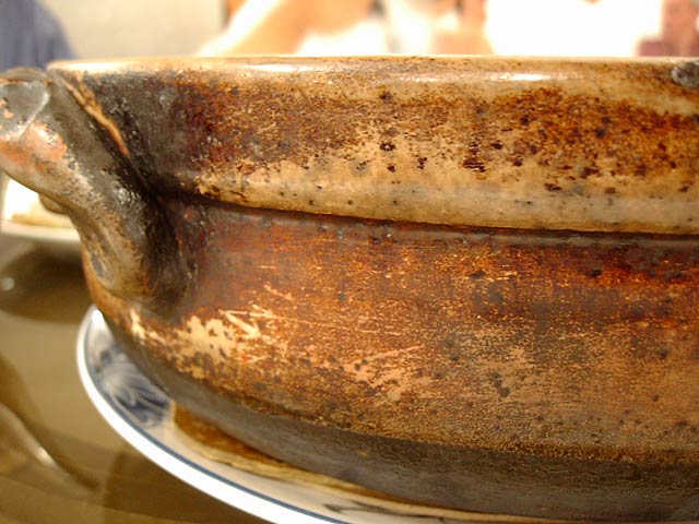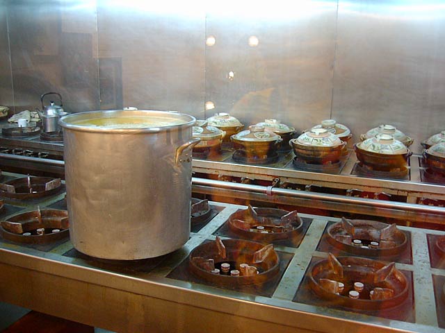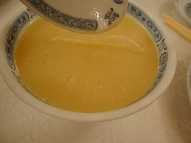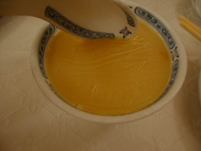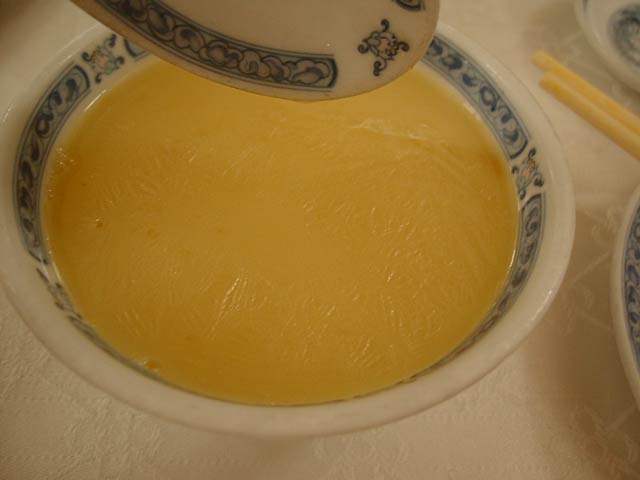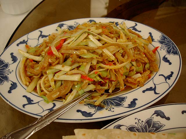 これが名物の10時間煮込んだ「砂鍋土鶏(1600元)」。グツグツすごい迫力です。 ここは四川料理のお店なのですがこの鍋はこの店のオリジナルで、辛くはないです。(JK) 土鍋が迫力がありました。天下一品のらーめんスープをもっと強くしたような味わいです。鳥と豚がよく煮込まれていて、きわめて濃い味付けです。最初の印象はかなり良かったけど、四人で食べきるにはちょっと単調かな。(ska) |
