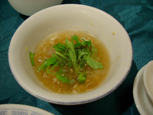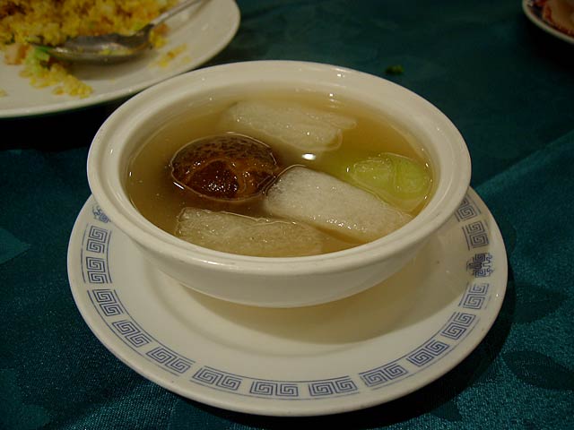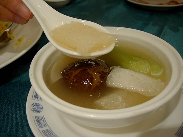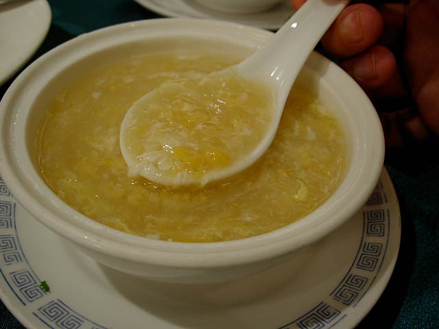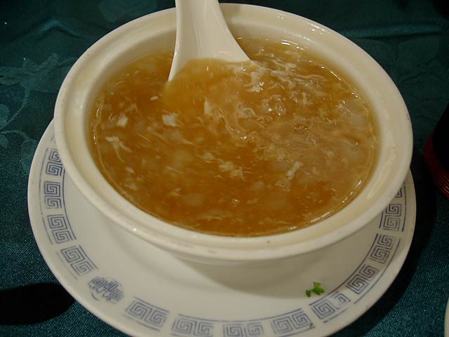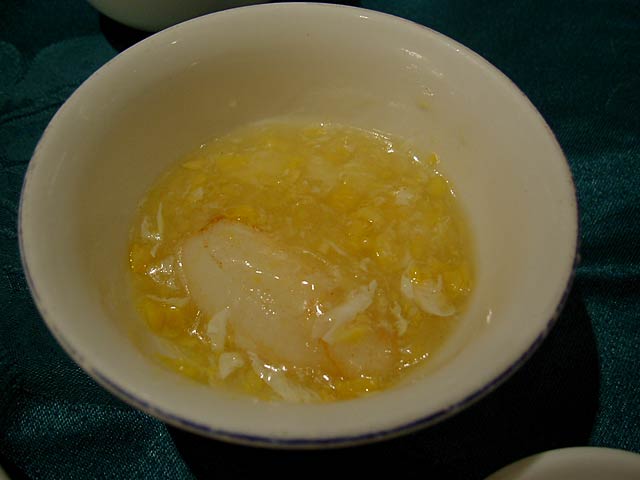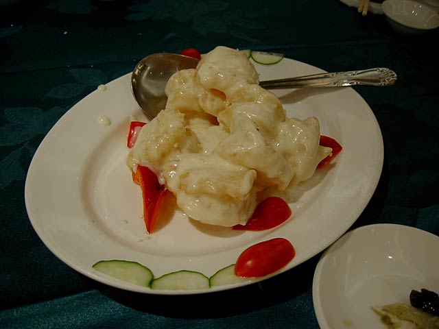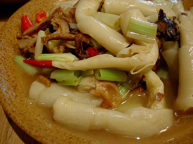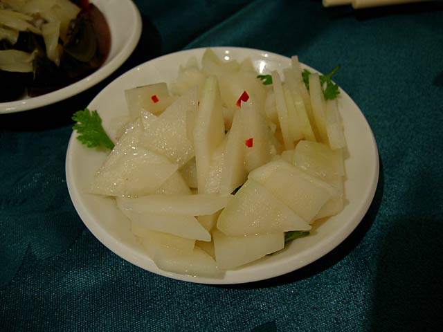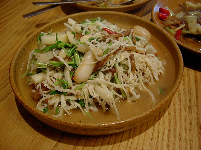 タケムシは筍だけを食べる長さ2〜3cmの純白の虫で、これを刺葱(山葱の一種で山椒の役割もする)と一緒に炒めた料理。タケムシそのものは無味無臭だそうですが、食べた感じはかっぱえびせんのようなサクサクした食感で、たしかにタケムシそのものの味はないようで刺葱の味が口の中に広がる感じです。(JK)