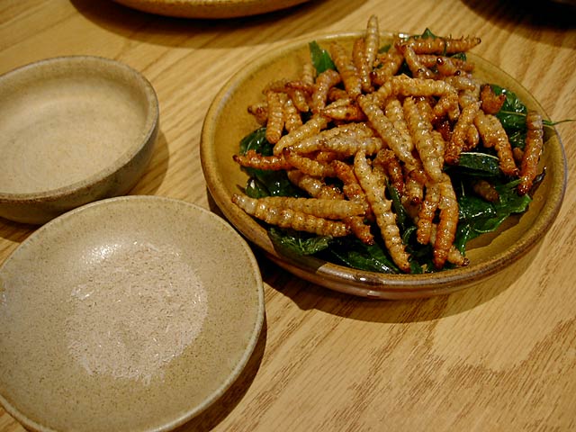 これも蜂のサナギそのものには味がないそうで、歯触りを楽しむ料理のようで、サクサクとした歯触りと香辛料の味が口に広がります。(JK)