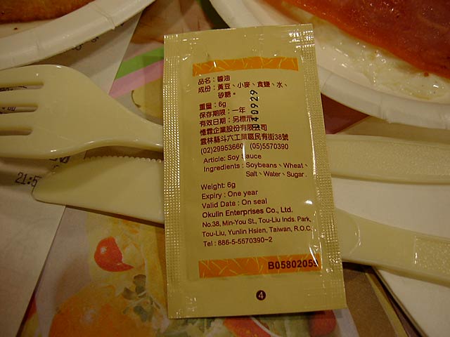 「成分:黄豆、小麦、食塩、水、砂糖」。日本のとはちょっと違いますね。砂糖が入ってるのは北海道などにあるという甘口醤油みたい?(JK)