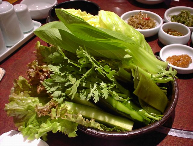 - サムパ定食(サムパブ)というのは、いろいろな葉野菜で味噌とご飯を包んで食べる料理です。サンチュや茹でたキャベツに味噌を塗り、エゴマの葉、春菊、キュウリ、唐辛子、ワカメなどを好きに乗せ、さらにご飯も一緒に巻いて食べます。一緒に食べることで野菜の味がご飯に染みわたり、味噌の味付けとあいまって、口の中で思わぬ美味しさが生まれます。韓国の「包む」食べ方の真骨頂を教わった思いでした。今回はさらにプルコギの味も加えて楽しむことができて大満足です。サムパ定食は焼肉を食べるとき一緒に頼んでもいいかも。(め)
