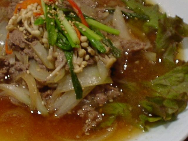 - サムパブと一緒に頼むといいよというskaさんのアドバイスに従いました。これにご飯とスープがついて2500円はちと高いような気がしないでもないですが、サムパブに合わせて食べると非常に力を発揮するのですね。サムパブだけだと味があっさりし過ぎているところにプルコギの肉の味が加わることで、ずっと豪華な料理になります。この組み合わせはおすすめ。(め)