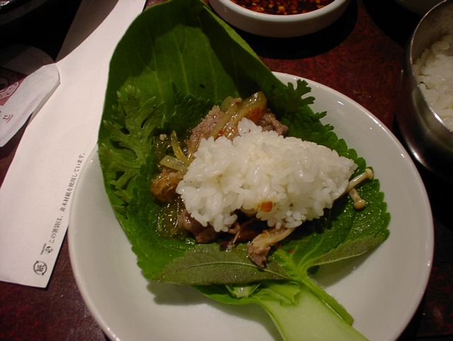 - まさか日本でサムパプ定食まで出している店があるとは思ってもみなかったので、とてもびっくりしました。韓国では人気のある料理ですが、出している店も多くないので、日本では知られていないと思っていました。サムパプとは、ごはんやおかずを葉っぱに巻いて食べるという料理です。これだけだとおかずが寂しいので、プルコギなどとあわせるのが普通です。(ska)