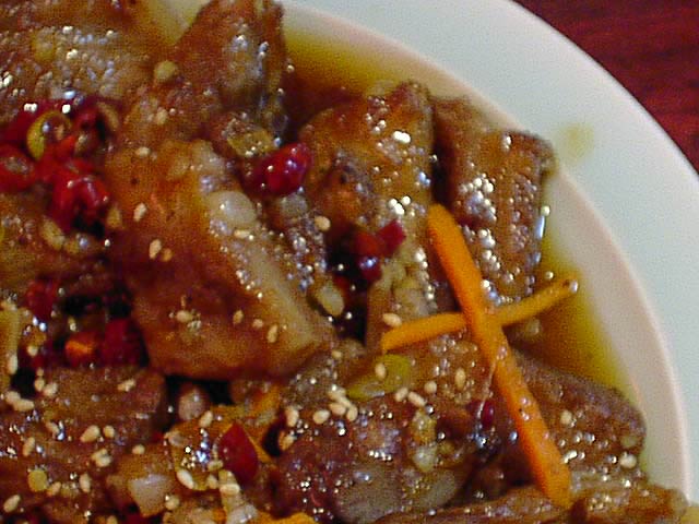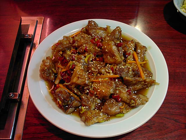 - 牛の血管の炒め物。唐辛子とクミンが利いていて、インド料理風の味付けです。牛の血管は以前に延辺館で串焼きにしましたが、こうして炒め物にしたほうがプリプリとした独特の食感が生きて美味しいですね。しっかりと弾力がありながら歯切れのよい、例えるならイカと牛の腸の中間くらいの食感です。クミンの香りもよく合って、癖になる一品です。(め)