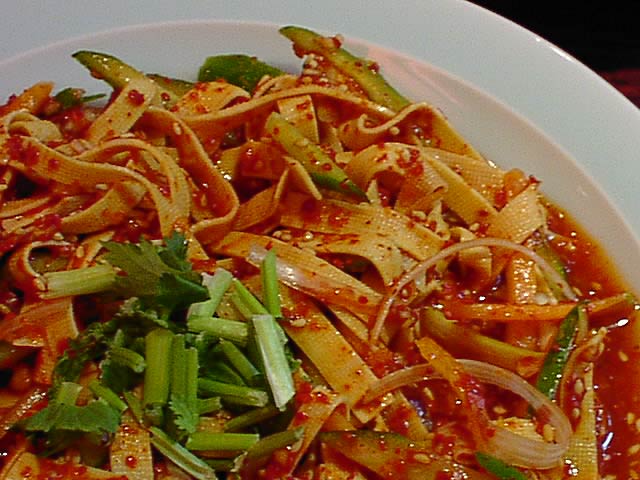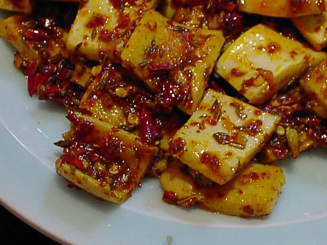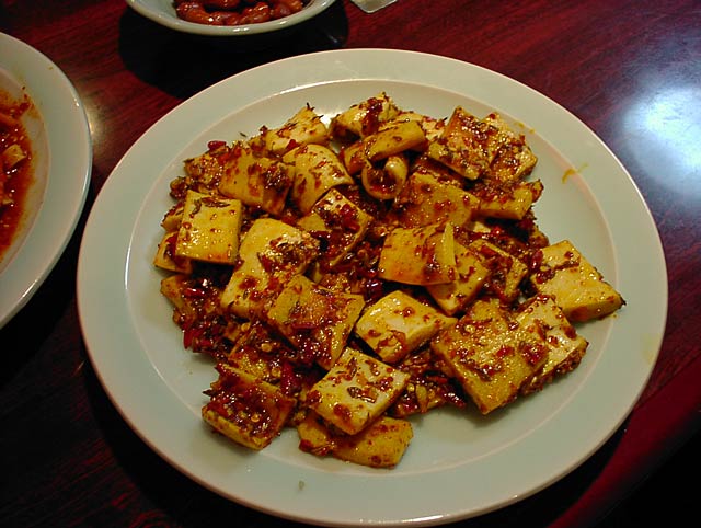 - 干し豆腐を酸っぱ辛甘いタレで合えた一品。メニューには他にも木耳、ズッキーニ、豚耳、ハチノス、イカなどを使った和え物があって、似た味付けになっていると思われます。この酸味と甘味の使い方や香菜を添えるあたり、どこか東南アジアの料理を思わせる味です。(め)