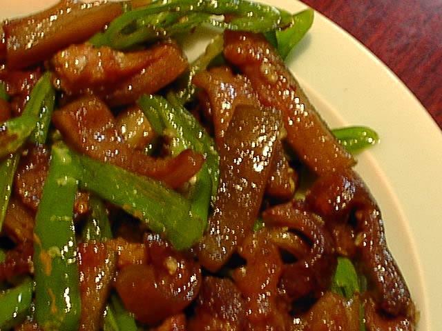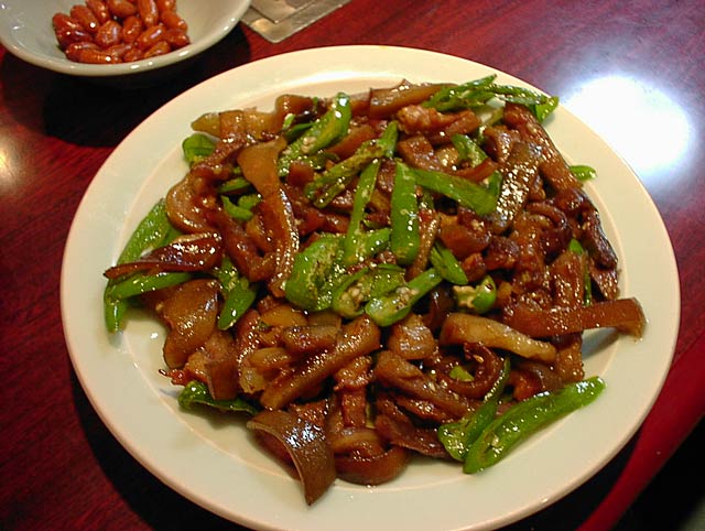 - 朝鮮族の犬肉料理は韓国料理屋のそれとはまた違った食べ方で面白いです。この店にも狗肉火鍋や狗肉湯飯といったメニューがあって興味を引きますが、今回注文したのは、皮の部分を青唐辛子と炒めた料理です。皮の下のゼラチン質の部分が堪能できます。噛み締めると強い弾力と共にむっちりと歯にしがみつく食感、その後に濃厚なうまみを感じます。皮の部分というと獣臭さを想像しますが、驚くほど臭みはなく、独特の好ましい風味を感じます。青唐辛子との組み合わせがまた絶妙で、ちょっと濃厚でしつこい皮の味を青唐辛子のさわやかな香りとシャキっとした食感が洗い流してくれるので、いくらでも食べられます。(め)