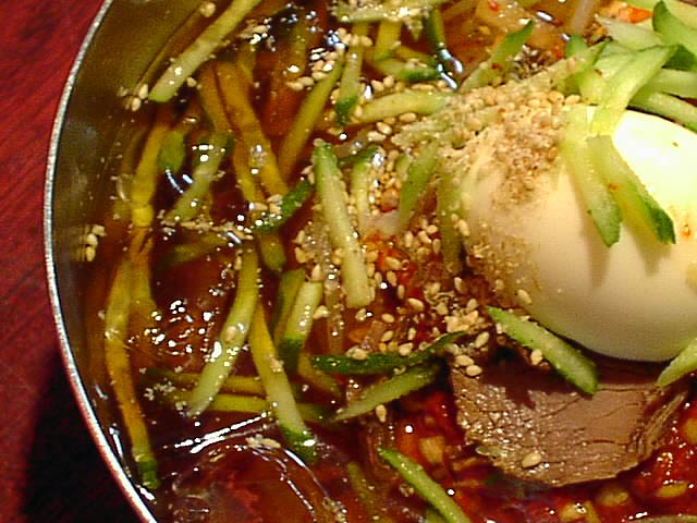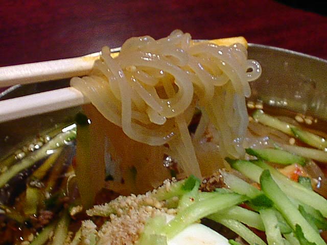 - この店は手打ち冷麺がおすすめ料理の一つになっています。押し出し式の製麺機なので糸コンニャクのような丸い断面の麺で、よく韓国料理屋で食べるハサミを使わないと切れないような冷麺とは違って、日本人好みの食べやすい麺です。麺もスープも美味しいのですが、具は肉がちょっと塩っぱかったり、スライスしたリンゴの芯の部分が口にあたったり、キュウリが季節外れだからかあまり美味しくなかったりでいまひとつかも。(め)
