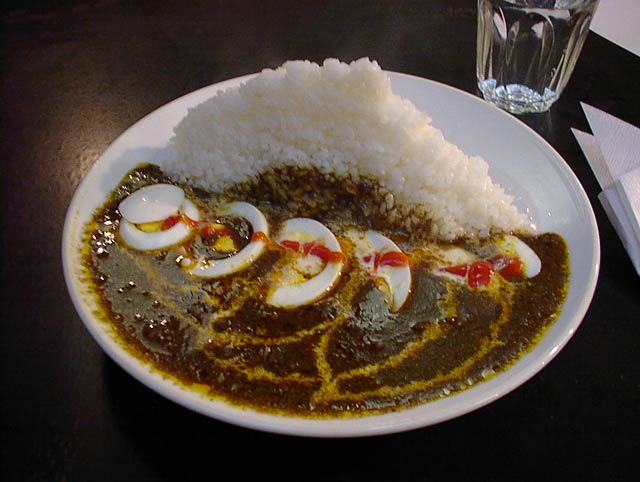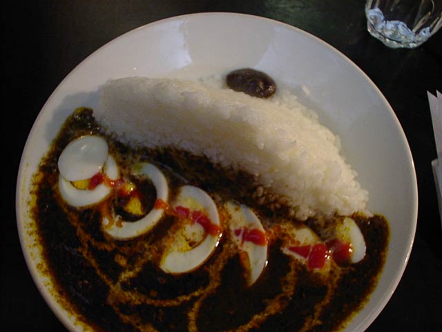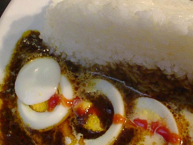 ムルギーが伝説の店と呼ばれるわけは、もちろん亡くなったご主人のキャラクターや店の雰囲気、カレー自体の(当時としては)ハイカラな味にもあったのでしょうけれど、この盛り付けのインパクトによるものが大きいのではないでしょうか。久しぶりにムルギーのカレーを食べて再発見したのは「こんなに美味しいカレーだったんだ」ということ。決して悪い印象があったわけではないのですが、どうしてもムルギーはカレーそのものの味より、それをとりまく物語のほうが強く記憶に残ってしまうので、冷静に一皿のカレーとして味わっていなかったと思うのです。なんとなく渋好みの味だったという記憶はありましたが、甘味が少なく、苦味が主体となったルーの味。形がなくなるまで煮込まれた鶏肉やタマネギの断片のかすかな食感と、スパイスのざらっとした舌触り。唐辛子のカッとくる辛さと調和した、スーっと染みてくる辛さ(よくわからないけど、ショウガが効いてるのかな?)。切り立ったごはんの陰にちょこんと添えられたチャツネの甘味がよい口直しになるし、ゆで玉子も硬派な味に心地よい温かみを与えてくれます。スパイスの香りも本格的で、スパイス料理が普及していたはずのない昭和25年当時からこの味でやってきたというのは本当にすごいことだなと思います。(め)