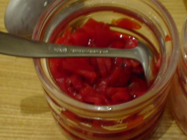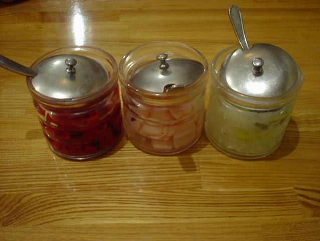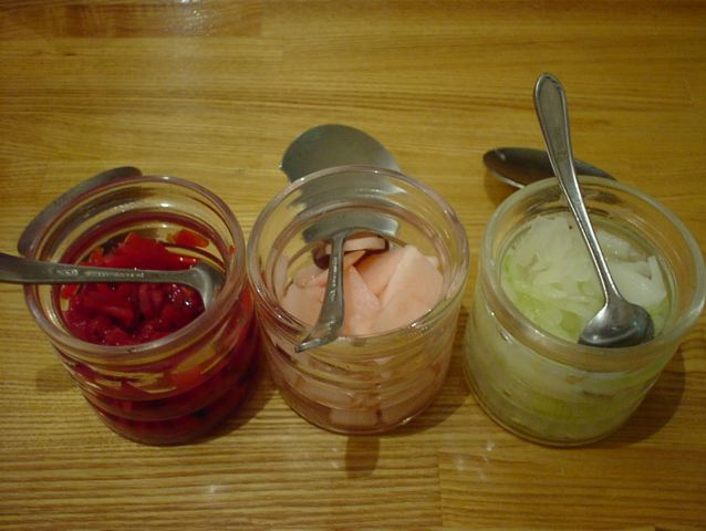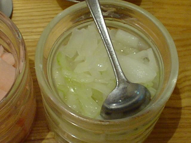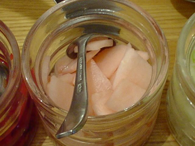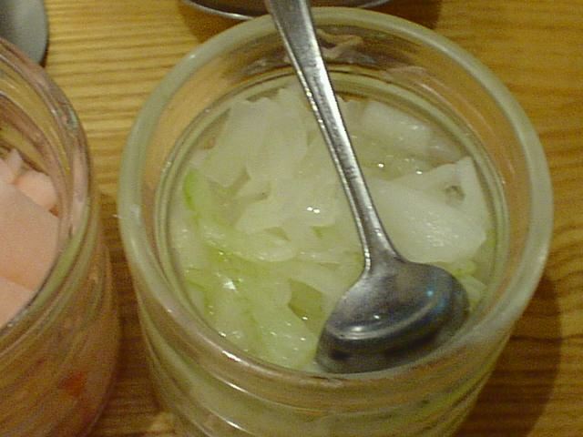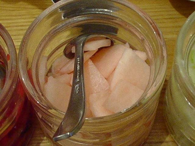 - 01:テーブルに置いてある薬味(左から福神漬け、大根桜漬け、さらし玉ねぎ)