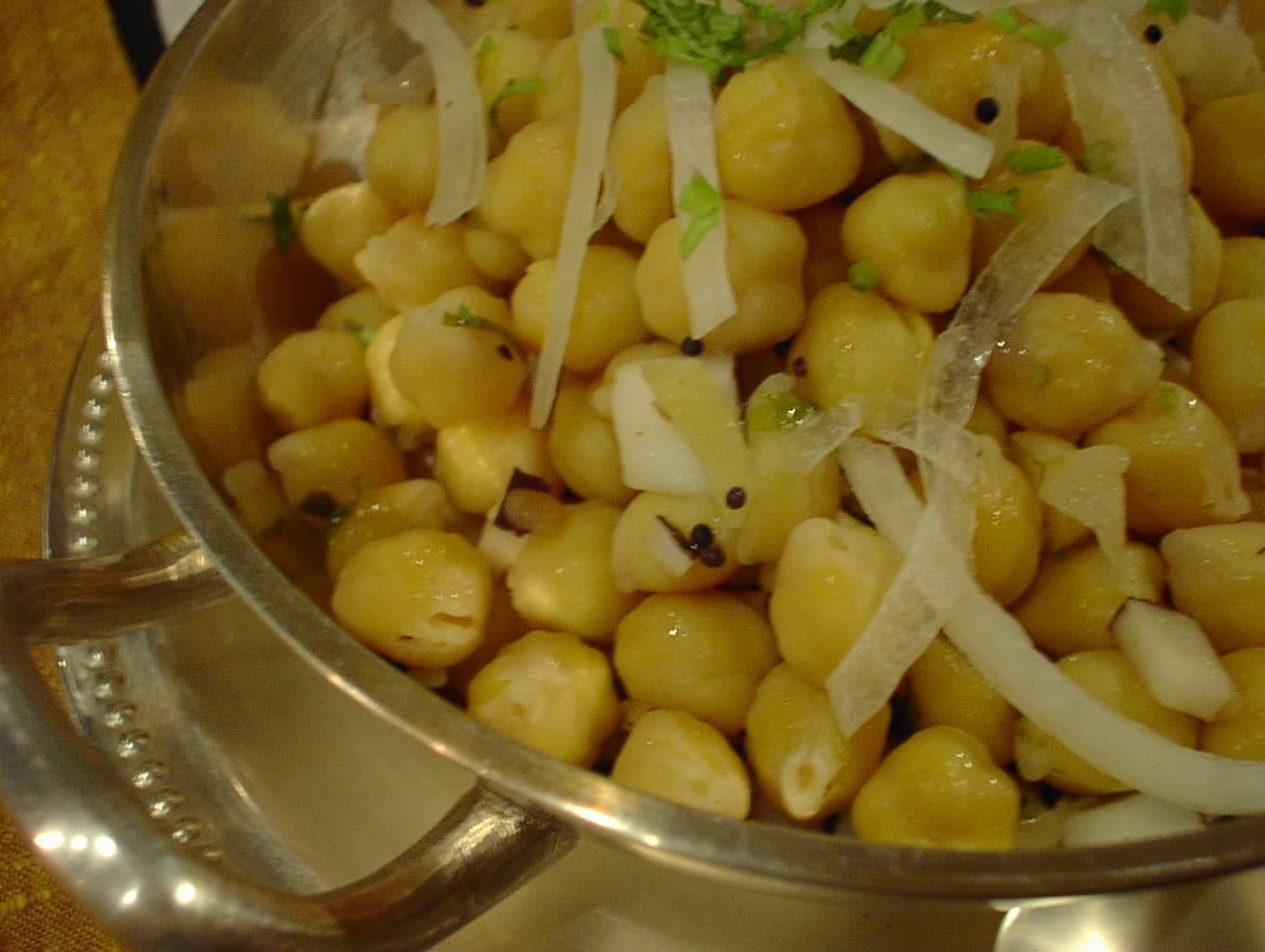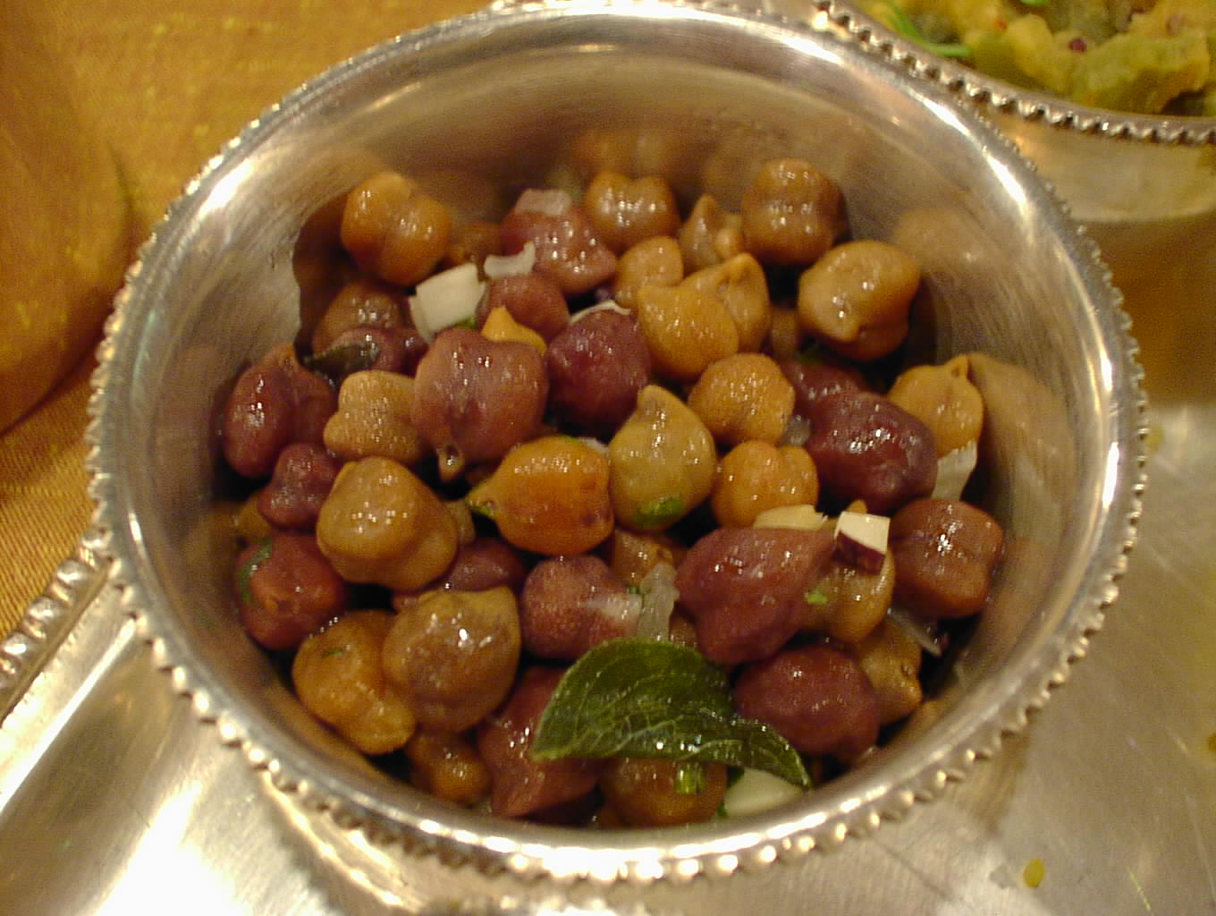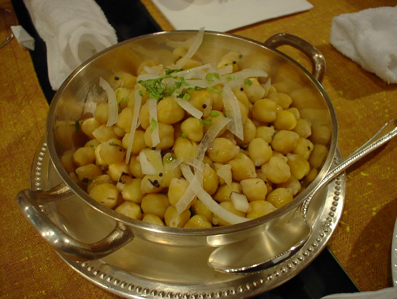 - 茹でたカブリ・チャナに塩、レモン等で味付けされている。味付けはシンプルに、チャナのホクホクした食感がここちよい。ときどきチャナに混じって、ココナッツの欠片が見え隠れしているが、こいつの食感もなかなかよい。シンプルな味付けなので、あっさりしている。(ピ)