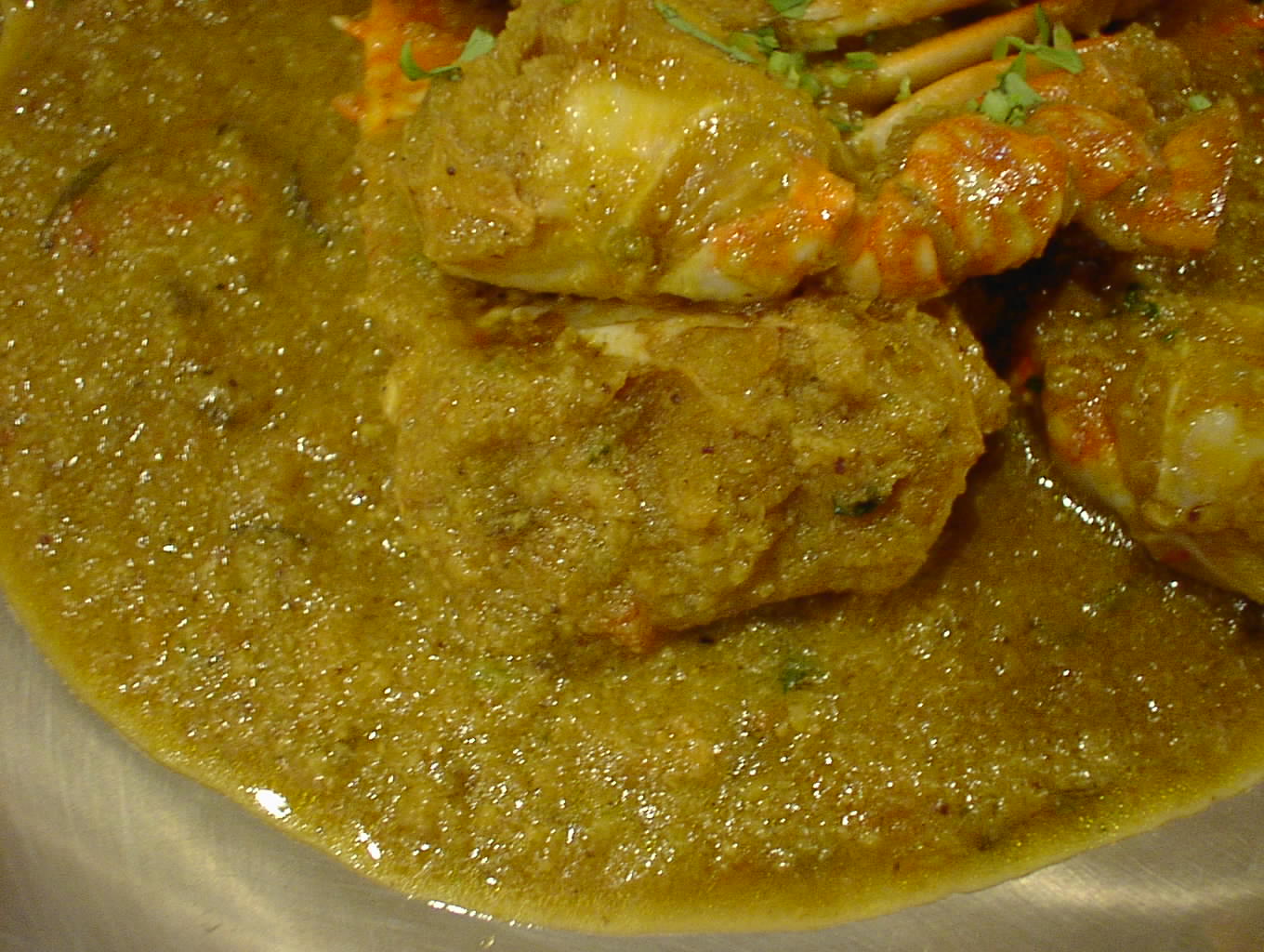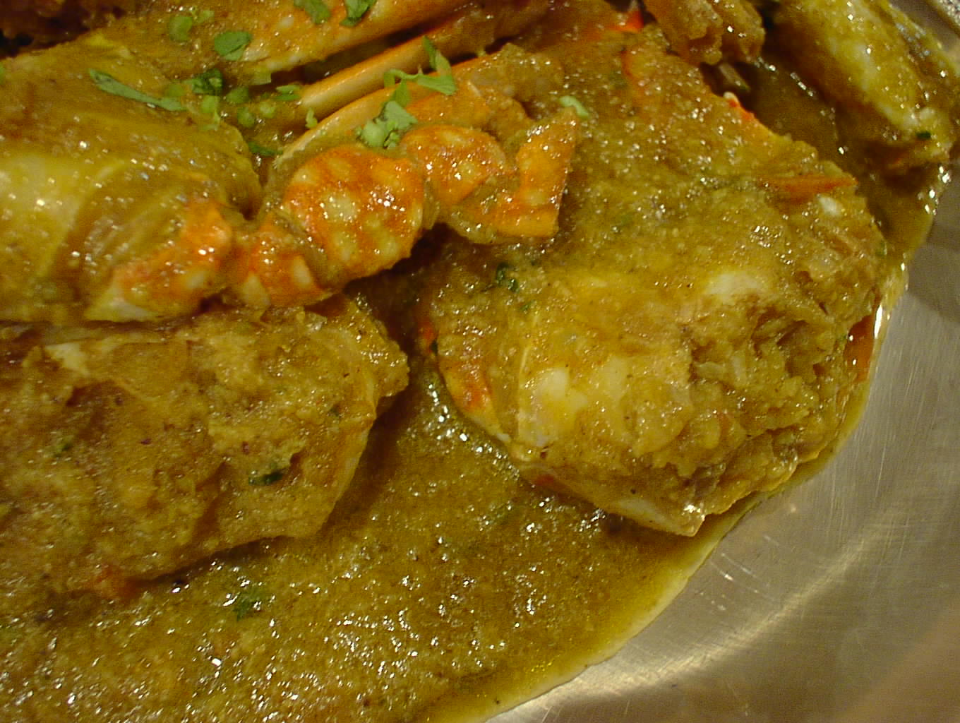 - 静から動へと転じるとはこのことか。カニのマサラ。手を使わずに食べることは不可能だろう。さすがにこれを食している時、皆の会話が止まる。皆しゃぶりついている。それにしてもやはりというかグレービー・ソースが秀逸。カニのエキスが十二分にグレービーにとけ込んでいる。と思いきやそのグレービーにとけ込んだエキスが、今度は身のほうにグッと入ってこれまた、足の部分等、エキスが溢れ帰っている。結構濃厚なイメージがあるだろうが、食べ口はあんがいさっぱりしている。グレービー・ソースは別皿にとりわけて、後でライスと混ぜ込んで食べるなんていうのも最高。(ピ)