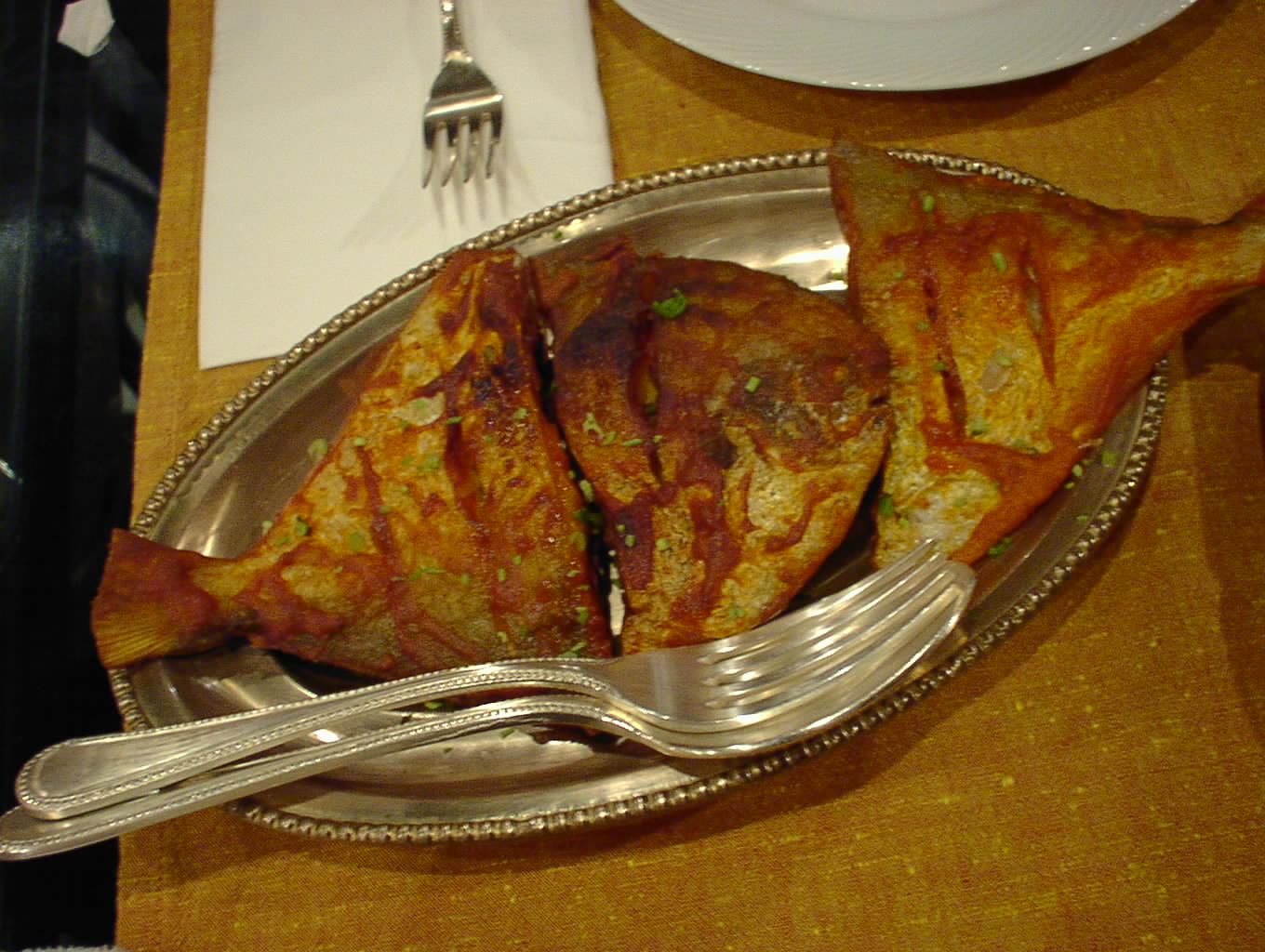 - 見事なメカジキ。こいつをシンプルにフライにしたもの。素材が良いからあまりゴテゴテいじりう必要もない。味がのっていてじつにイケてる。(ピ)