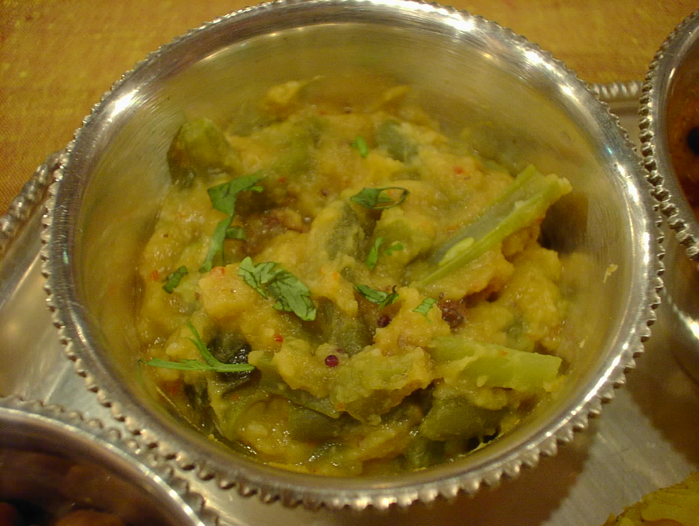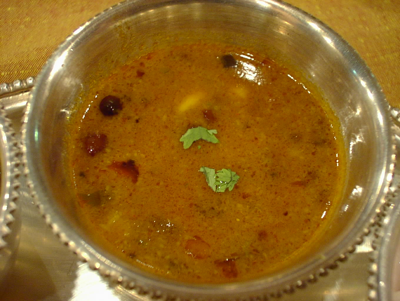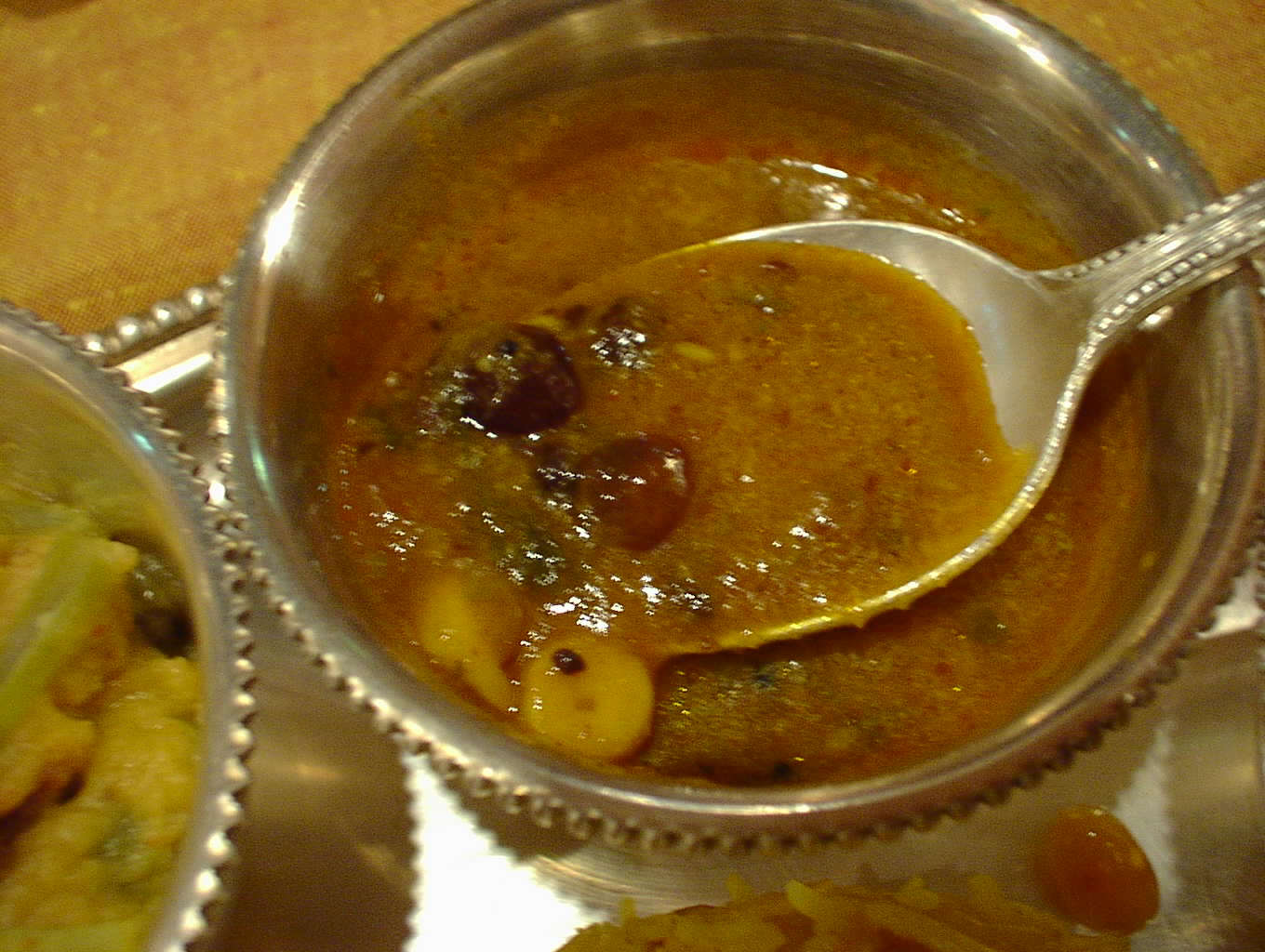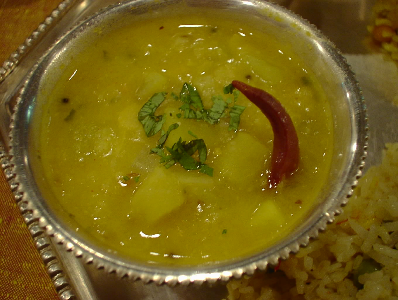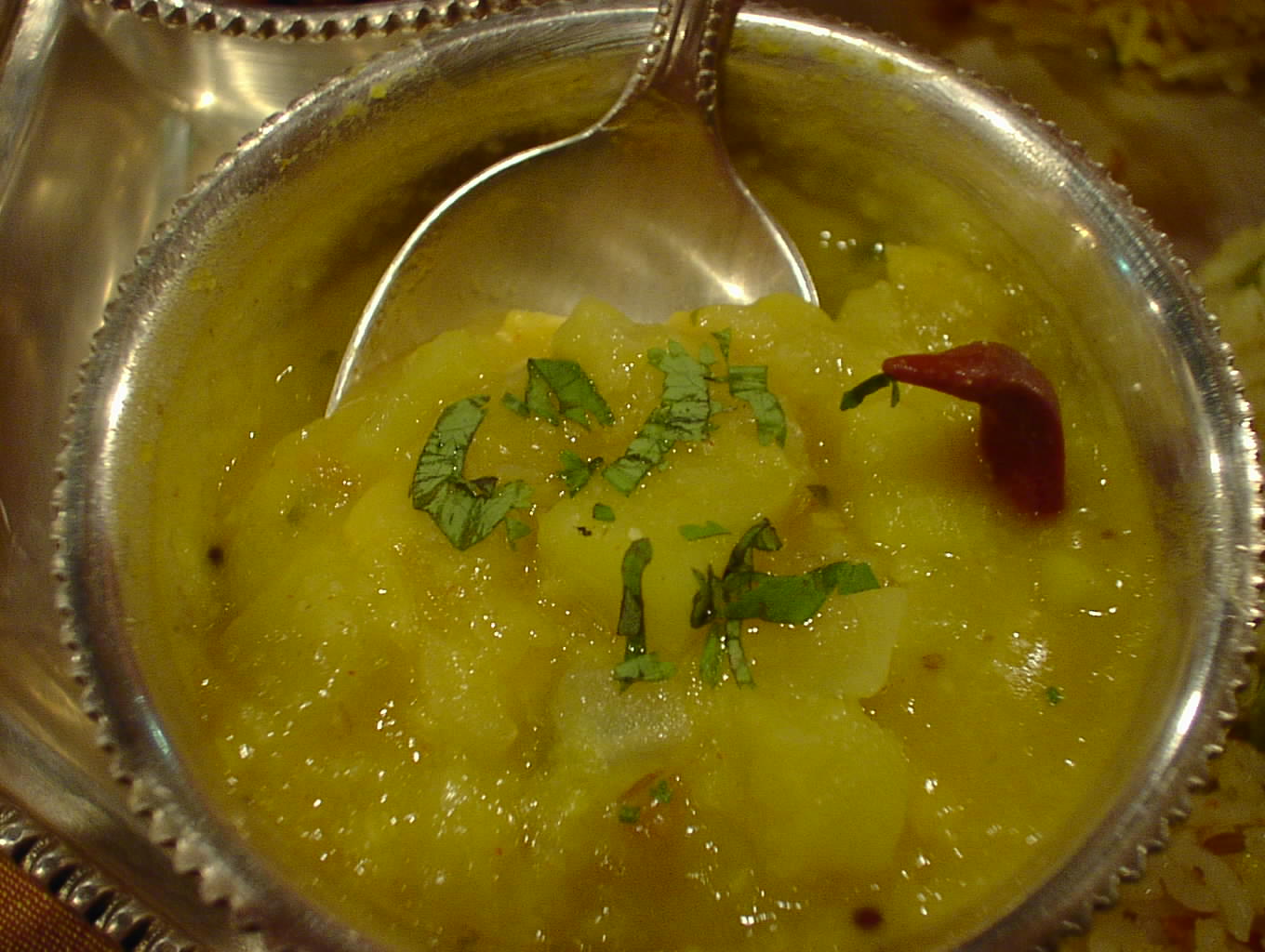 - ダルと野菜をまろやかに煮た料理。このダルはムング・ダルかな。ジャガイモの甘みがダルの甘みに加わって、まろやかで、あいかわらず素晴らしい。タマリンド・ライスなんかと一緒によく混ぜて食べると美味。(ピ)