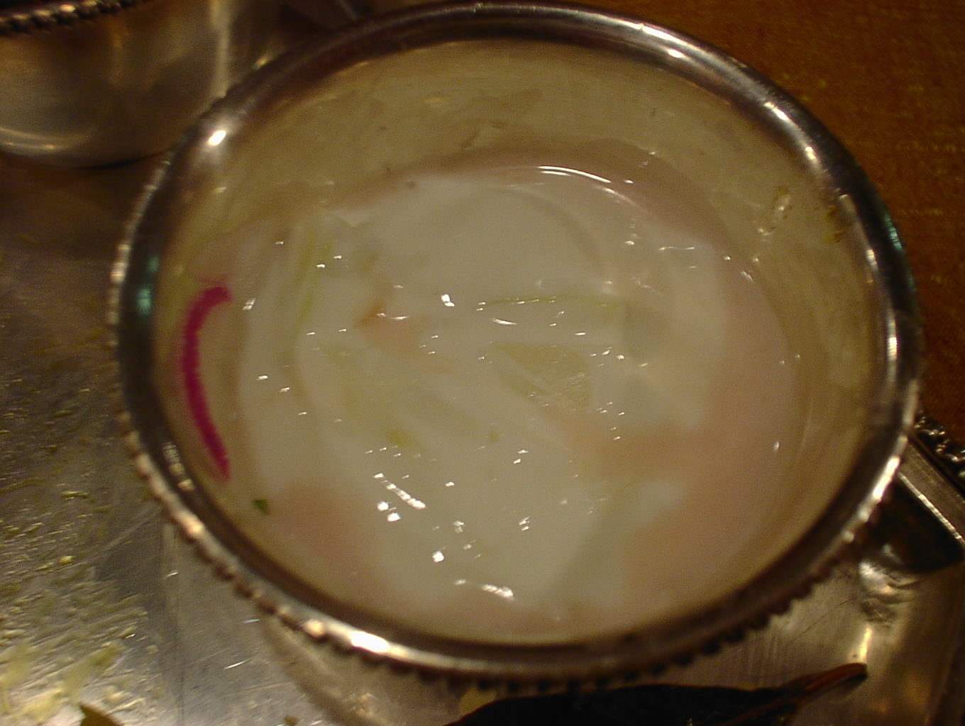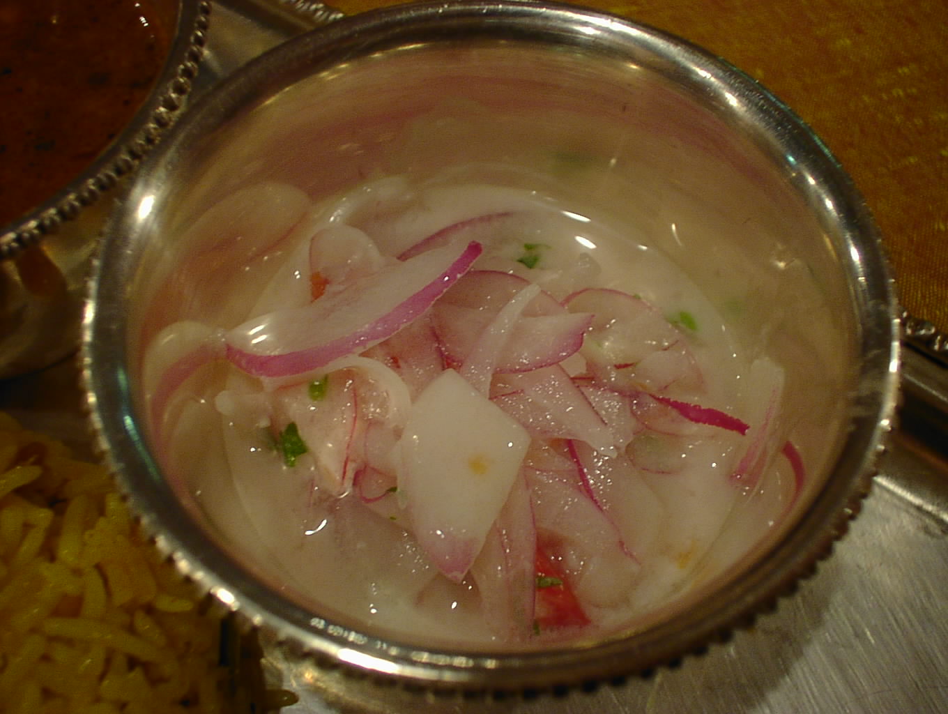 - 薄くスライスされた赤タマネギのライタ。これはスペシャル・プラオとのカップリングで楽しむものだ。ライタとプラオ(ビリヤニも)の相性は抜群。(ピ)