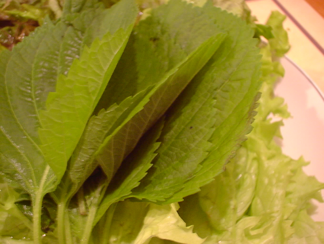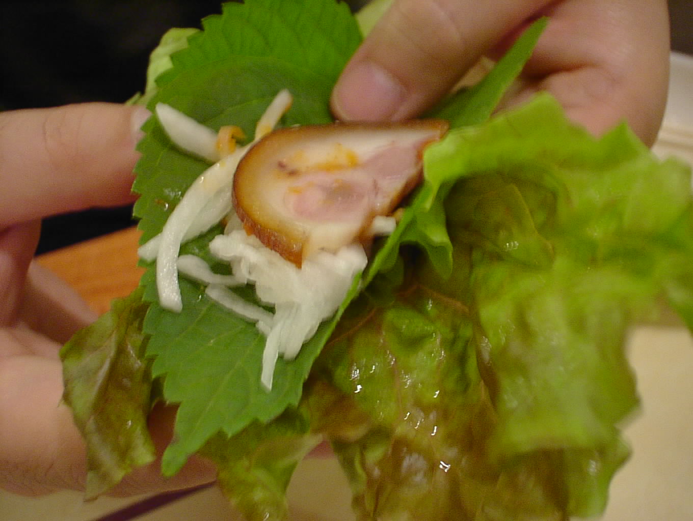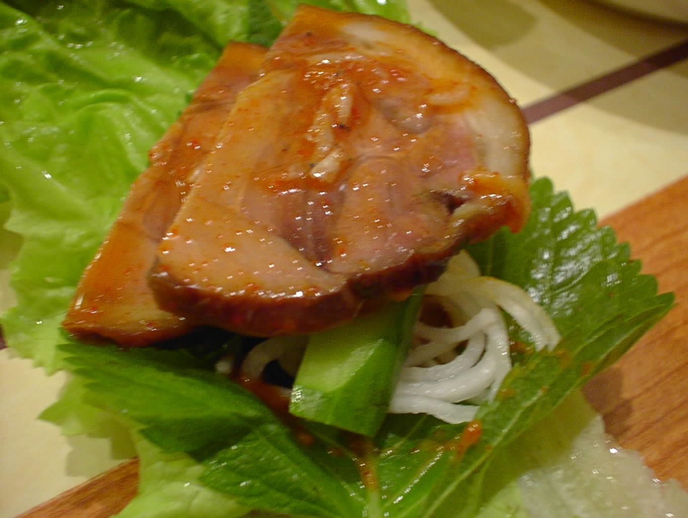 - サンチュと大葉にコチュジャンを塗り、そのなかに豚足とニンニク、青唐辛子を巻いて食べます。とっても美味しい。(い)