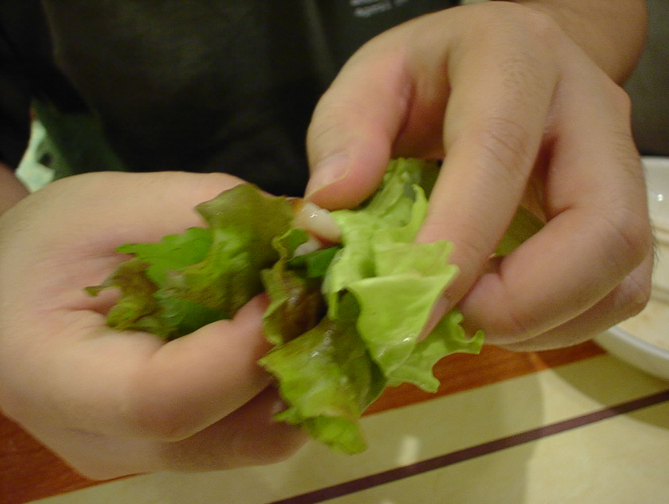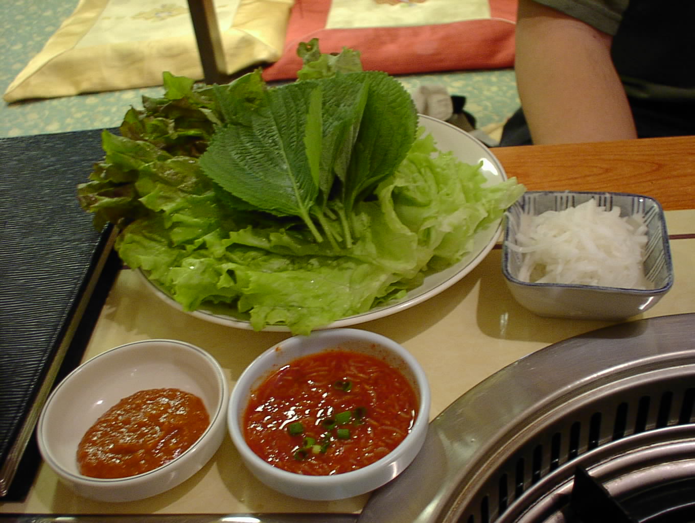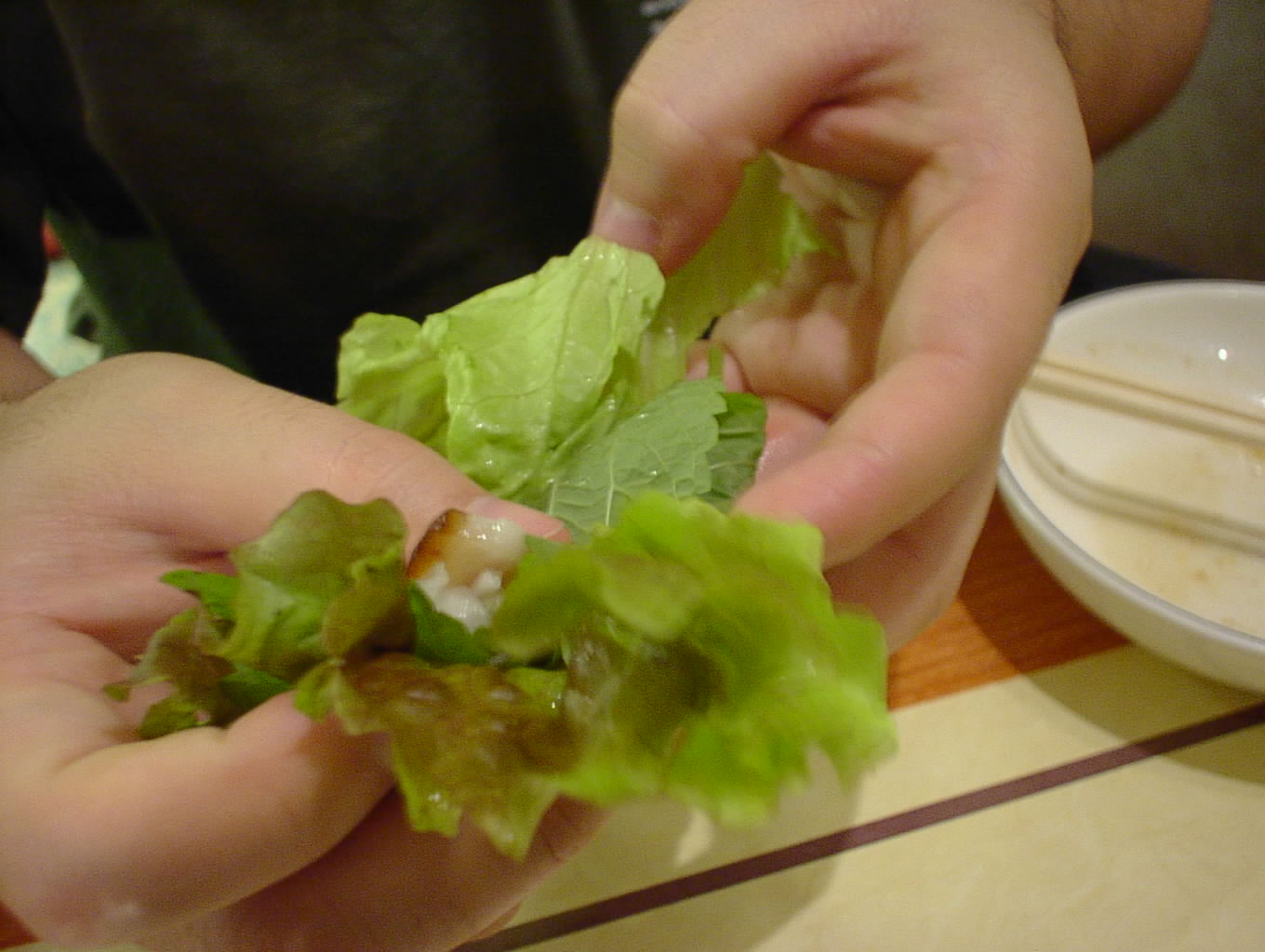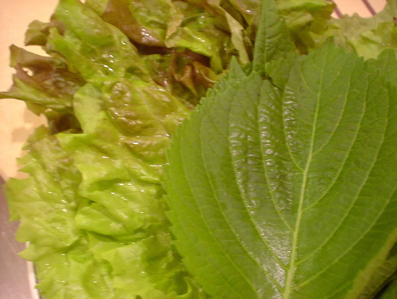 - サンチュと大葉にコチュジャンを塗り、そのなかに豚足とニンニク、青唐辛子を巻いて食べます。とっても美味しい。(い)