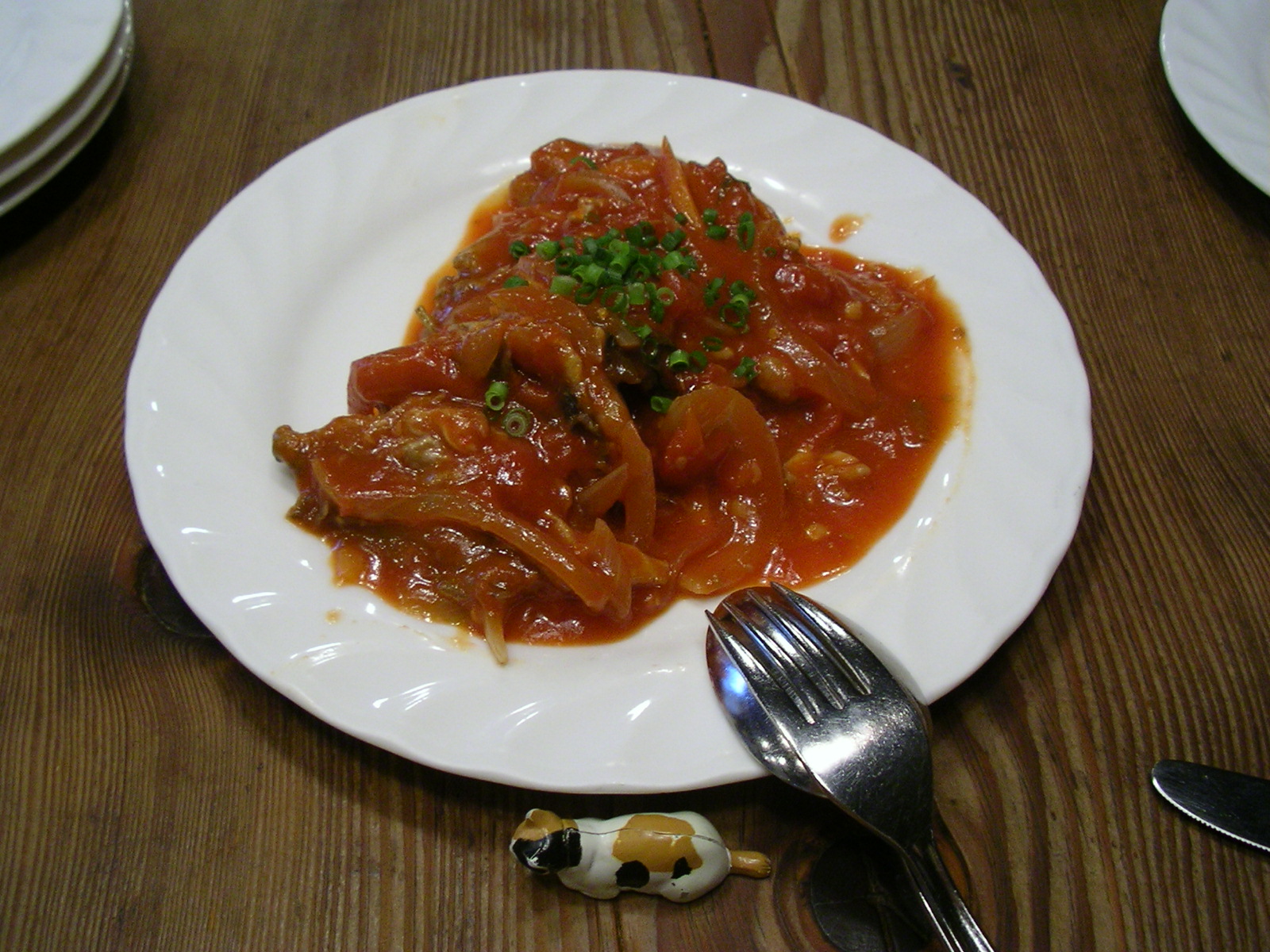 - 鯵に薄い衣をつけて焼いたか揚げたかしたものに、ピリ辛のトマトソースがかかっています。(び)