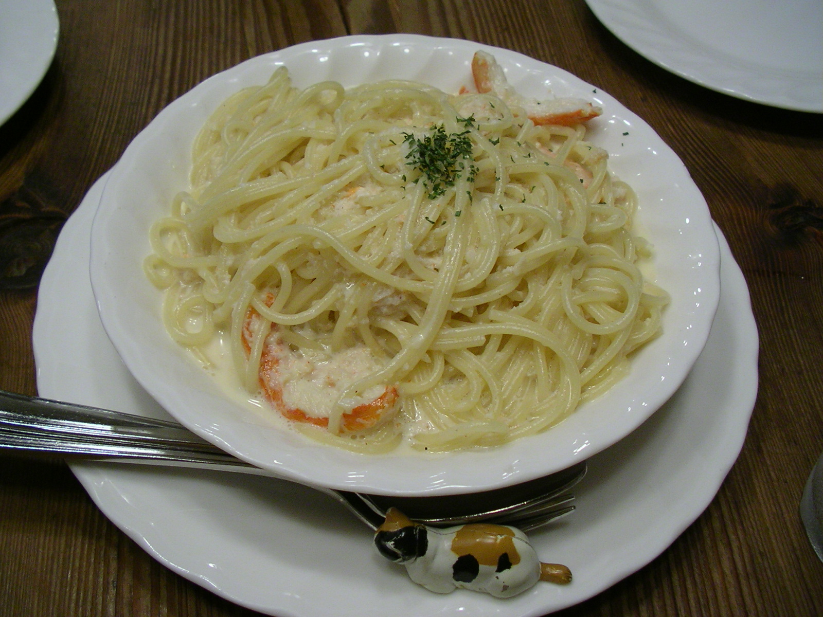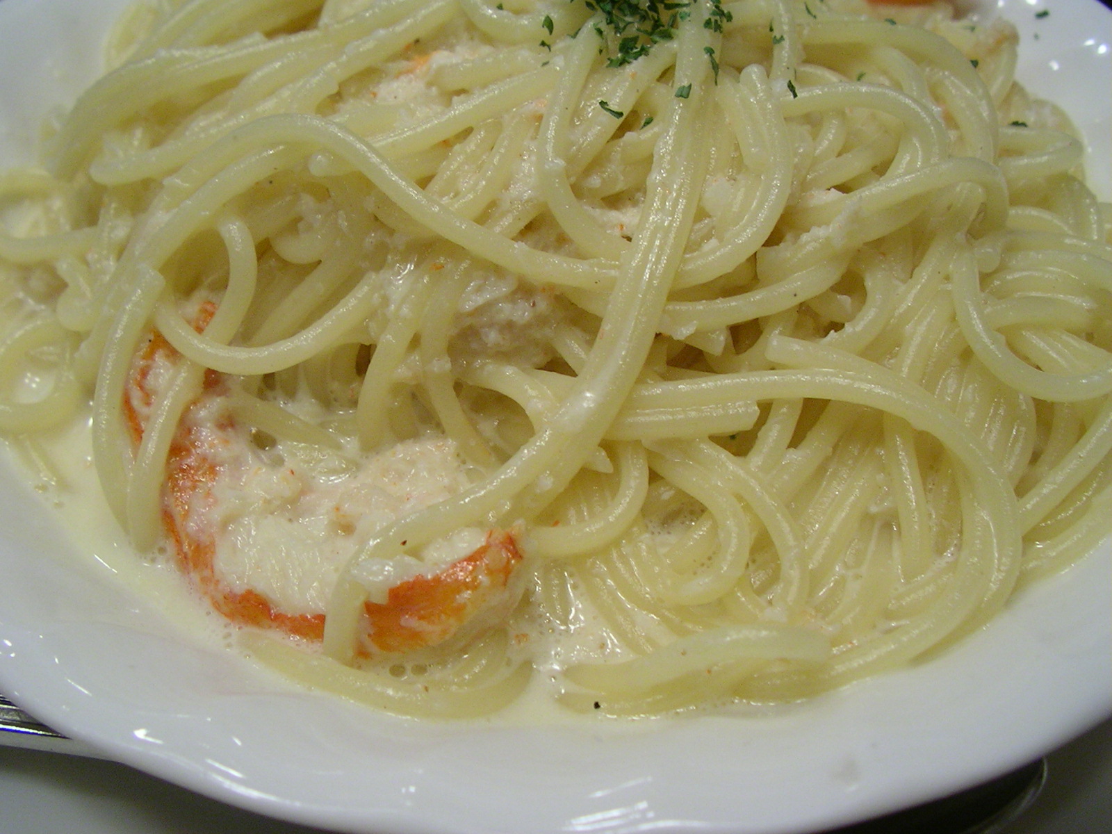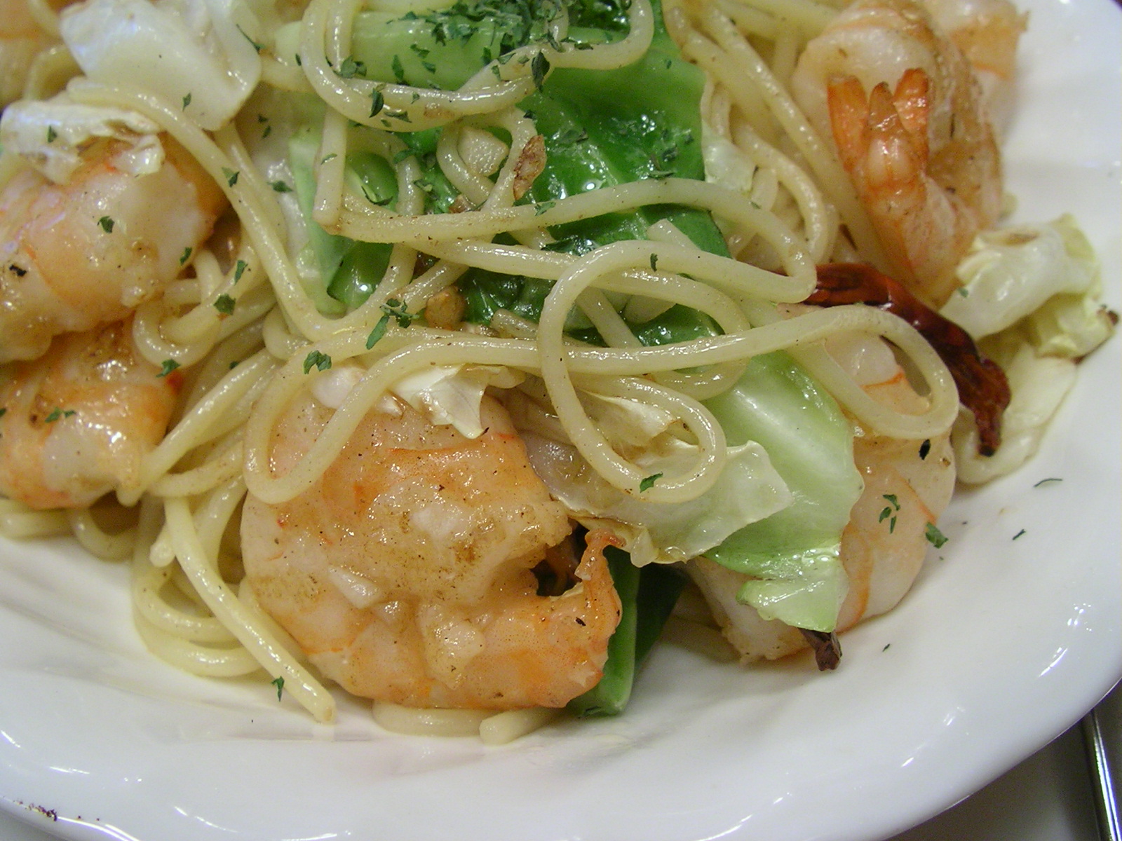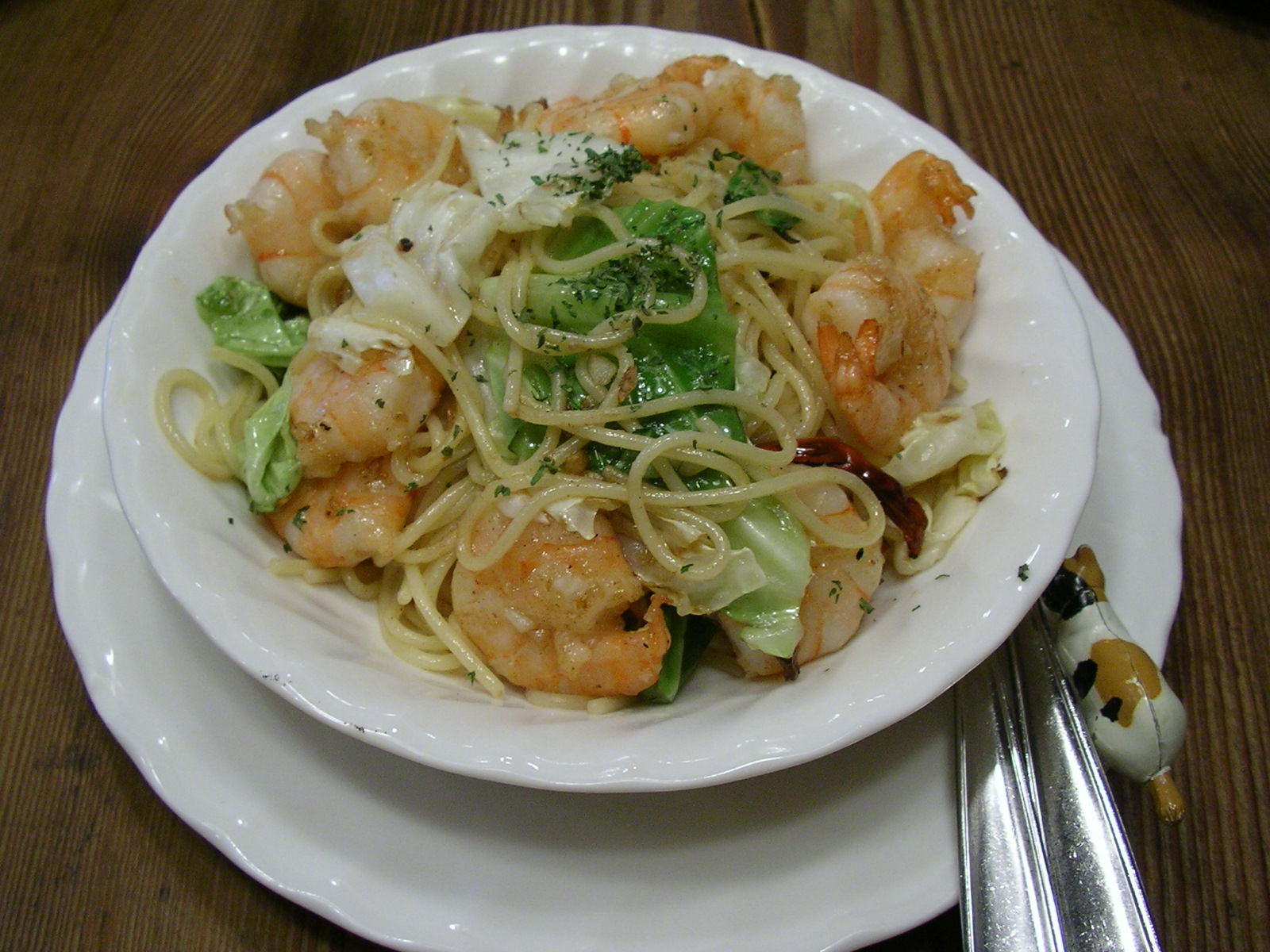 - ペペロンチーニ風のスパゲティに、わりと大きめの海老が12尾と春キャベツが入ったものを想像してもらえばいいかな。