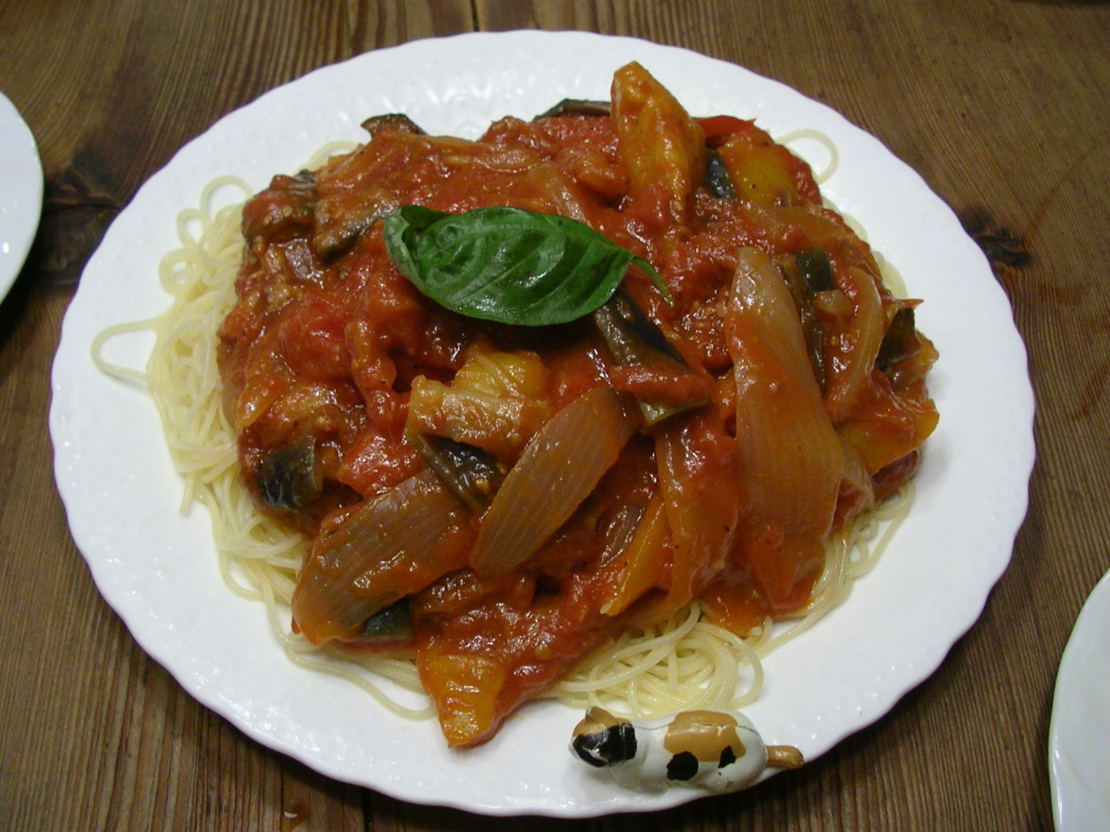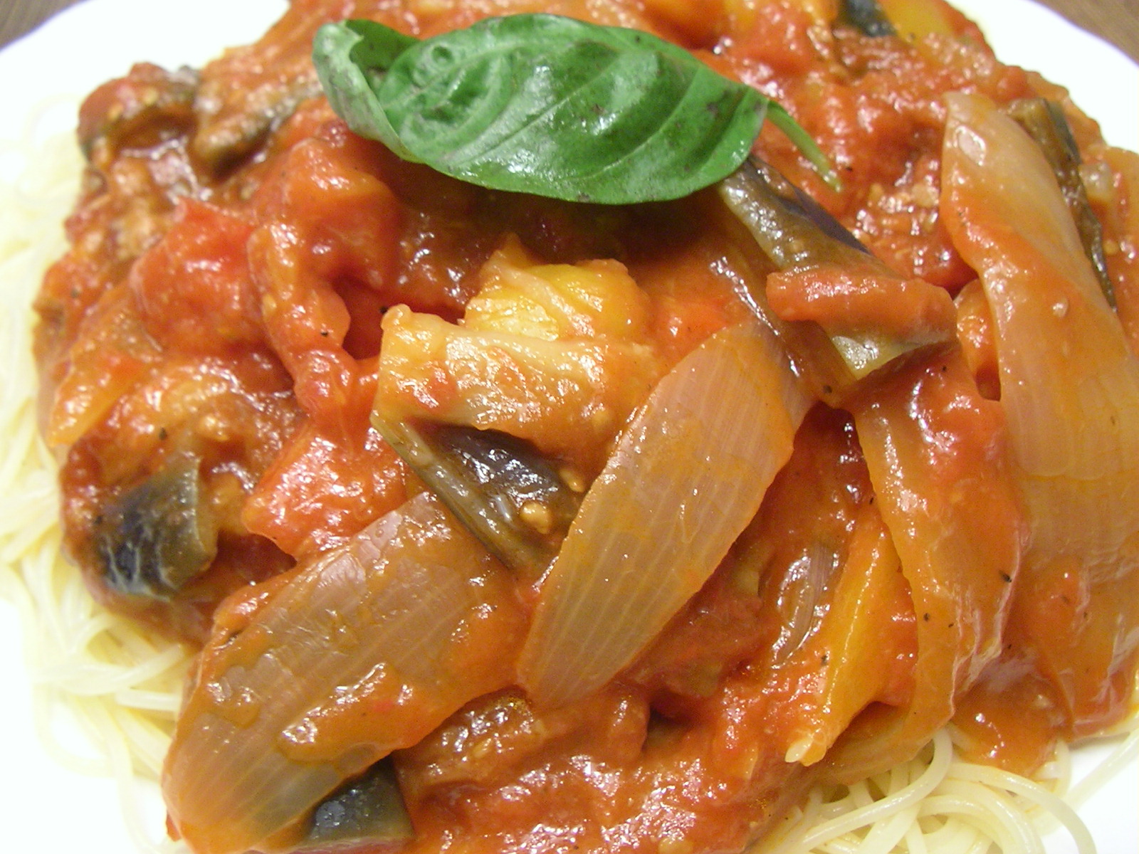 - 野菜たっぷりの冷やしたラタトゥーユが、細いパスタの上にかかっています。