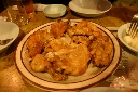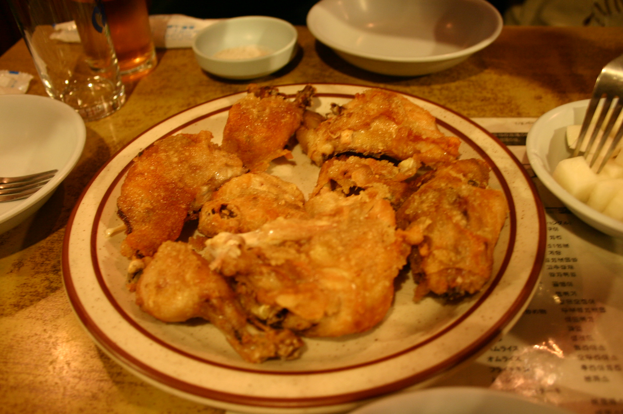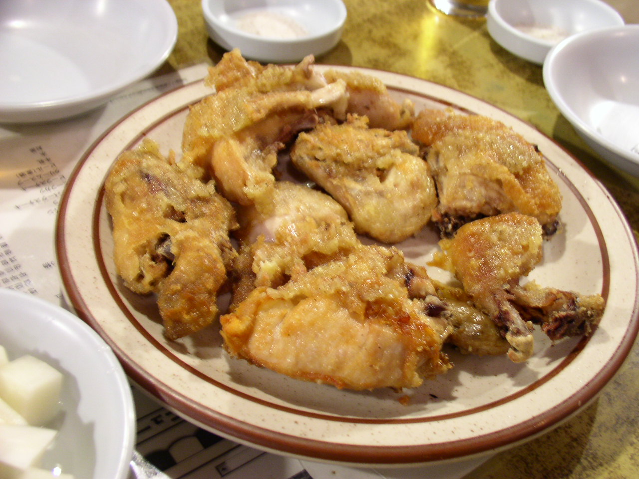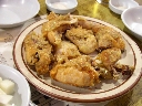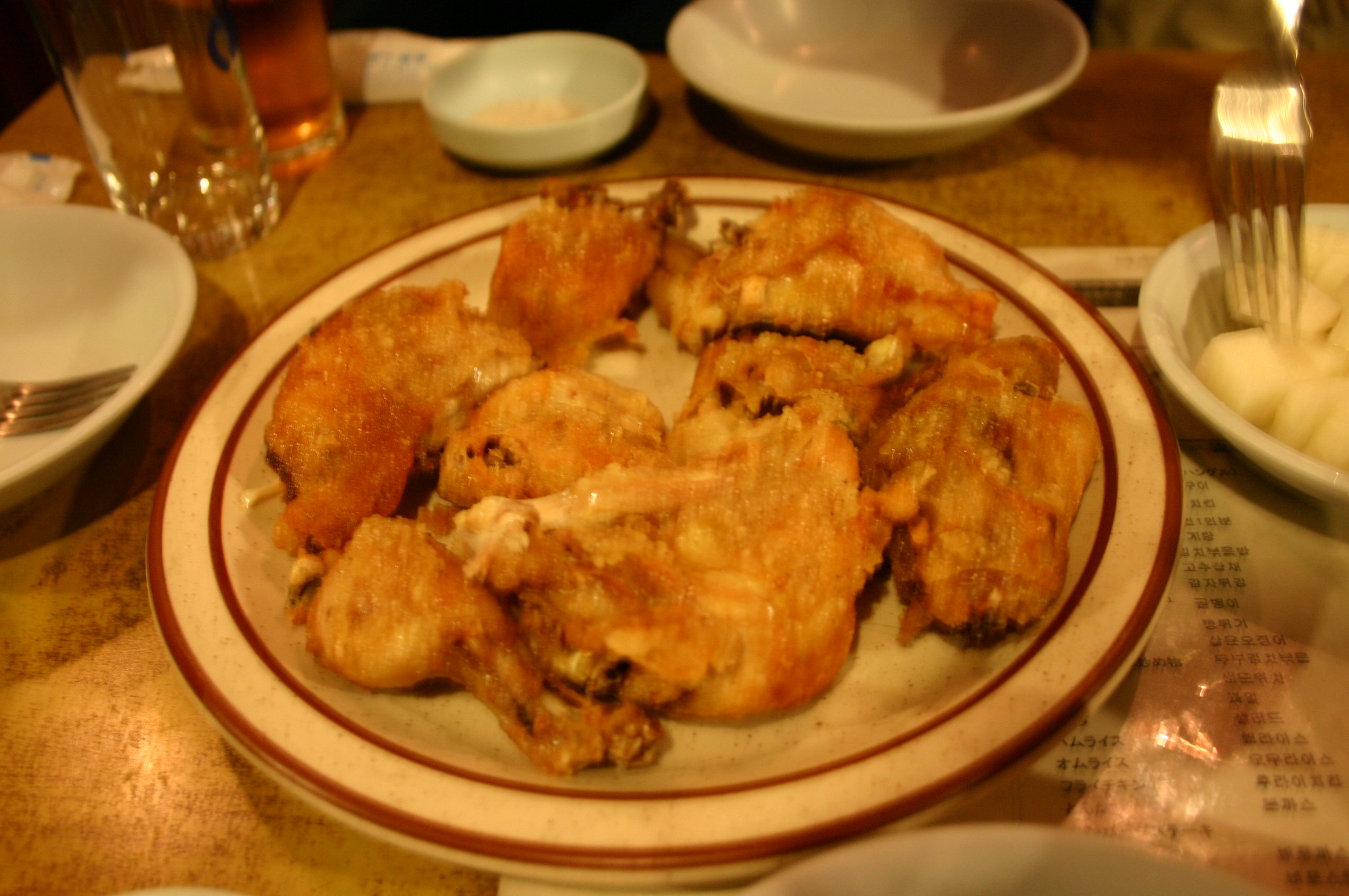 マヌルチキン(よく揚げたチキンにニンニクソース)と